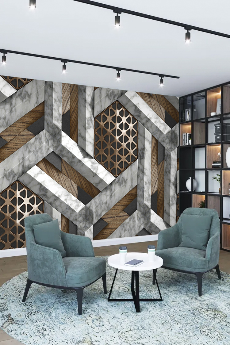 Ahşap, Mermer ve Siyah Geometrik Desenli Duvar Kağıdı