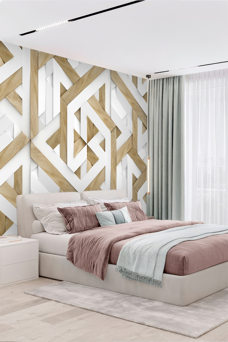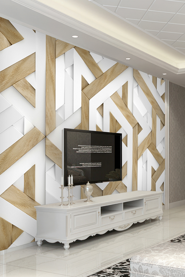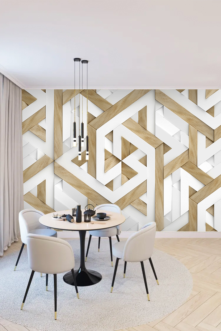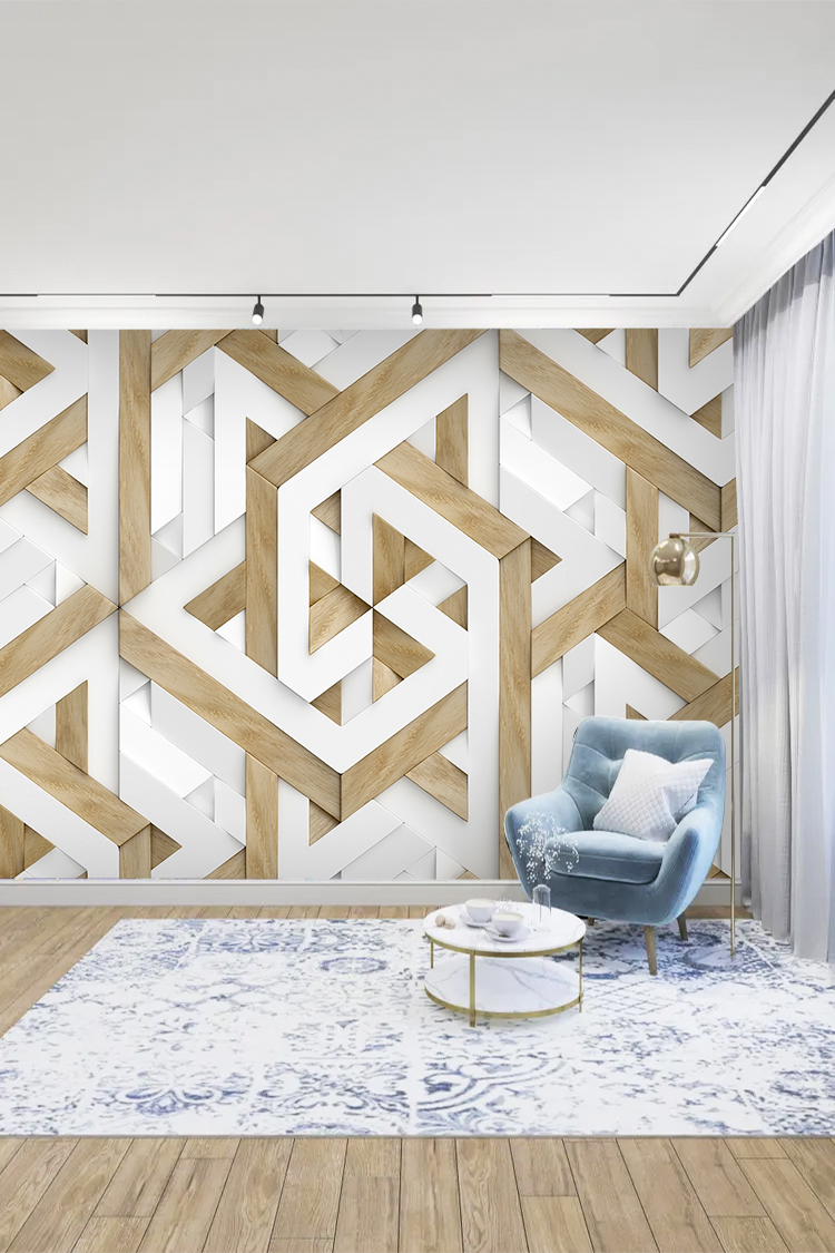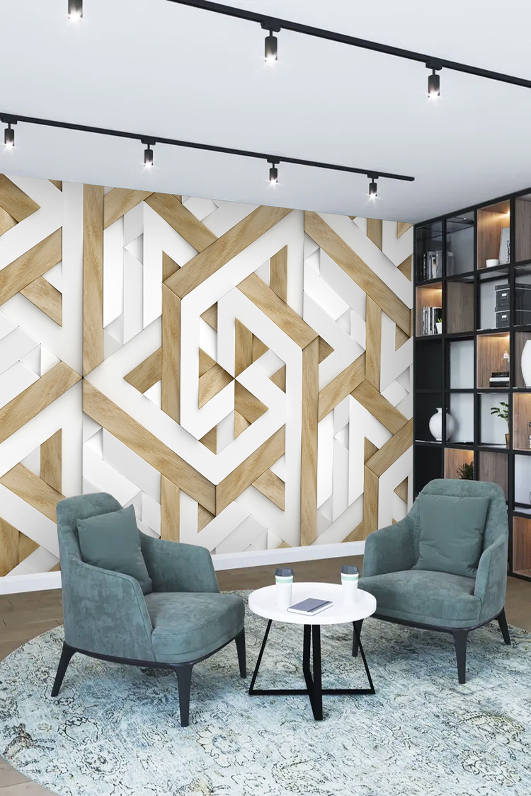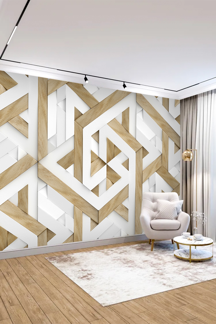 Ahşap ve Beyaz Geometrik Desenli Duvar Kağıdı
