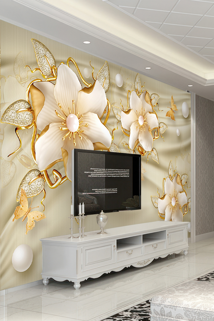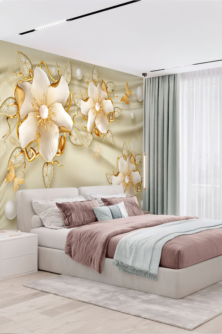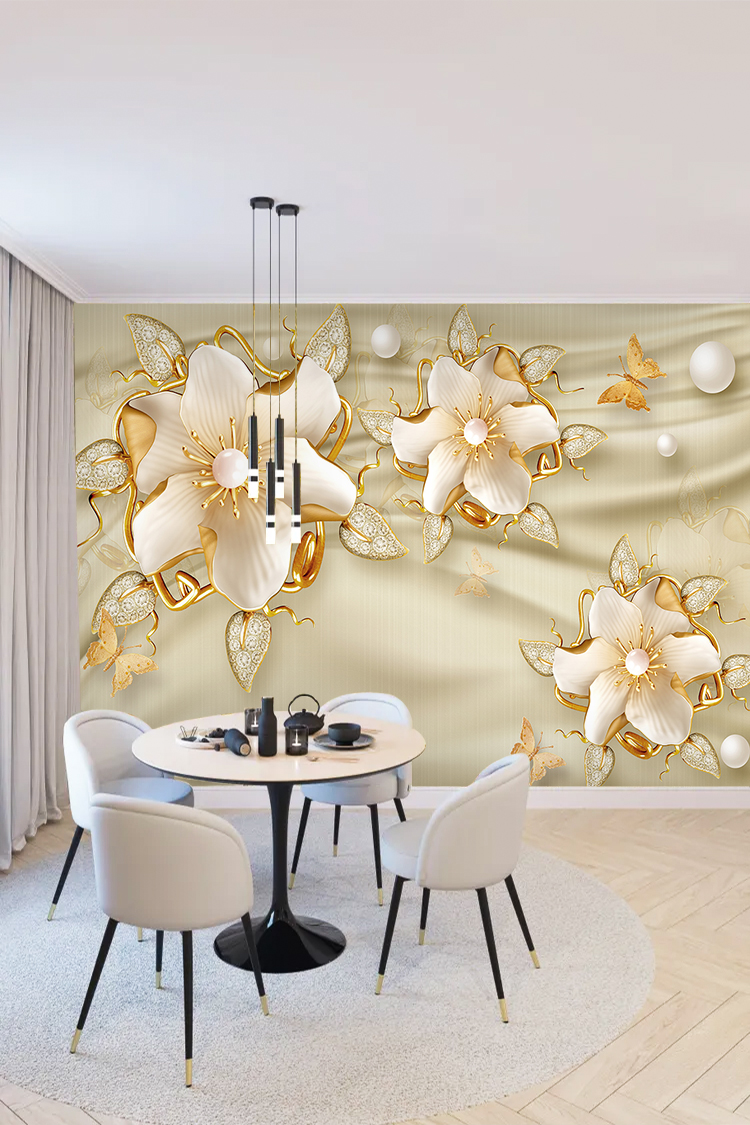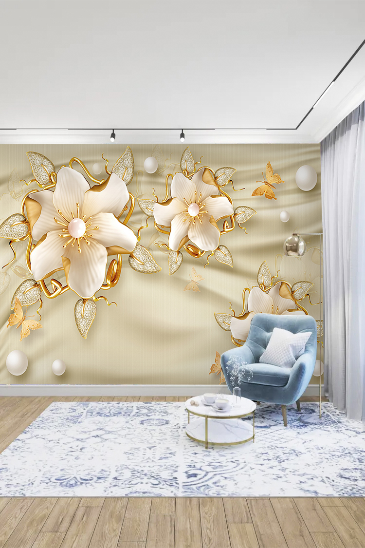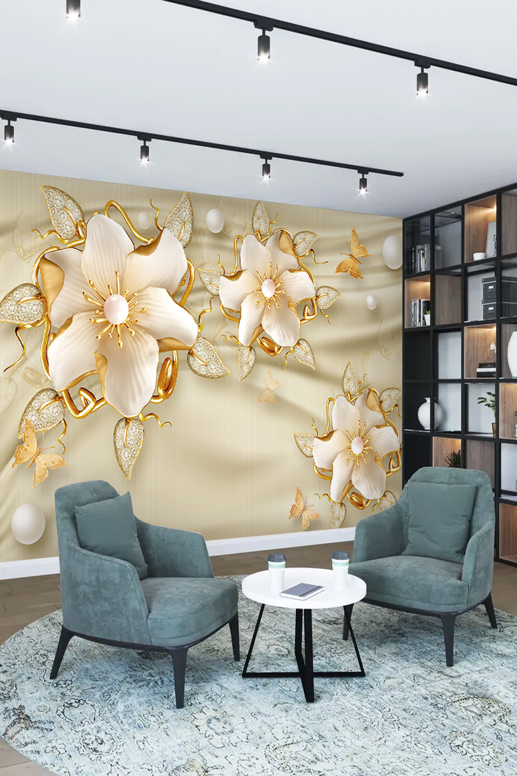 Altın Çiçek ve İnci Desenli Duvar Kağıdı