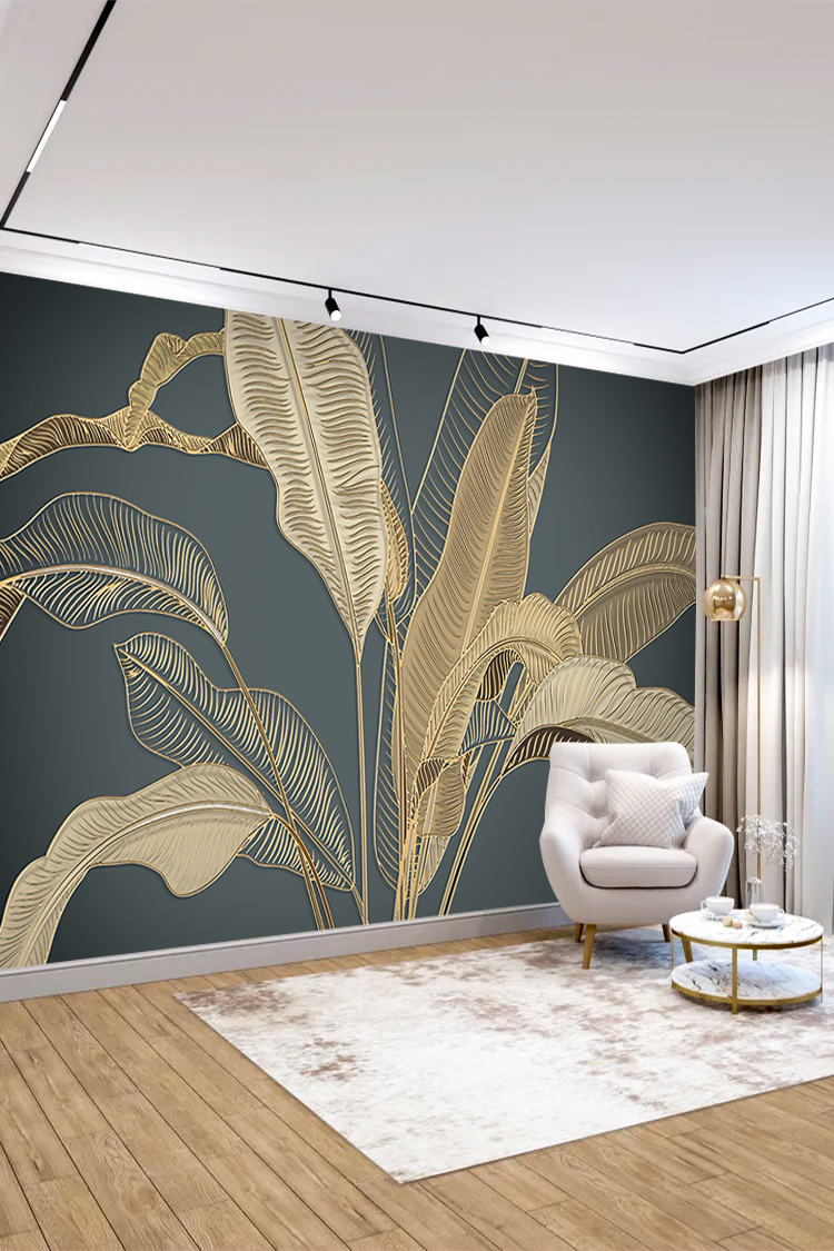 Altın Tropikal Yaprak Desenli Duvar Kağıdı