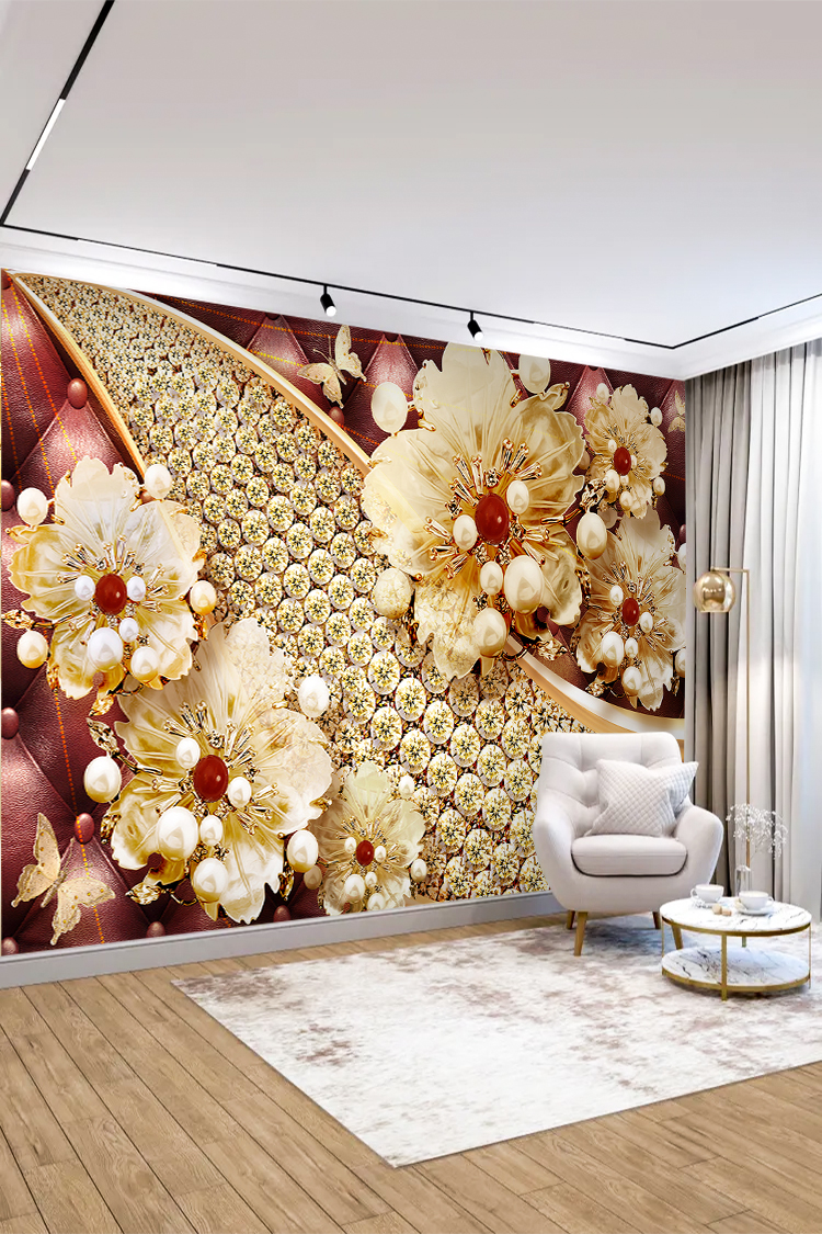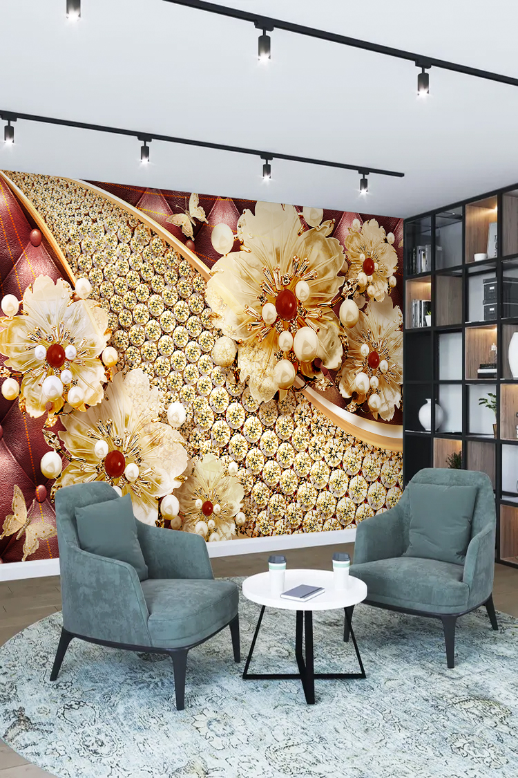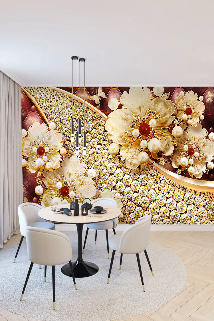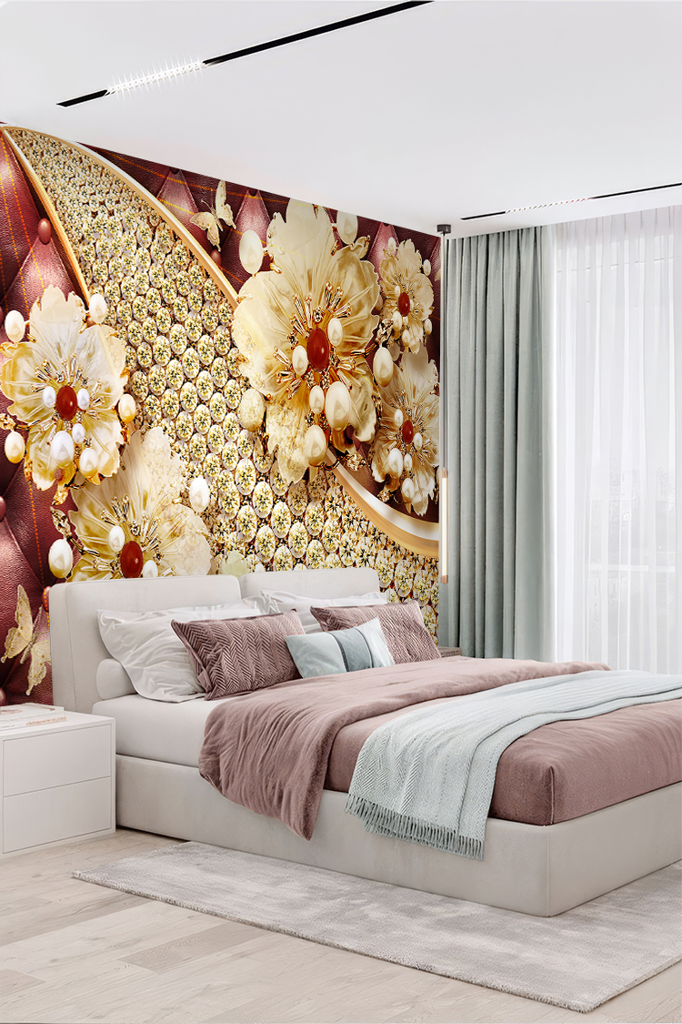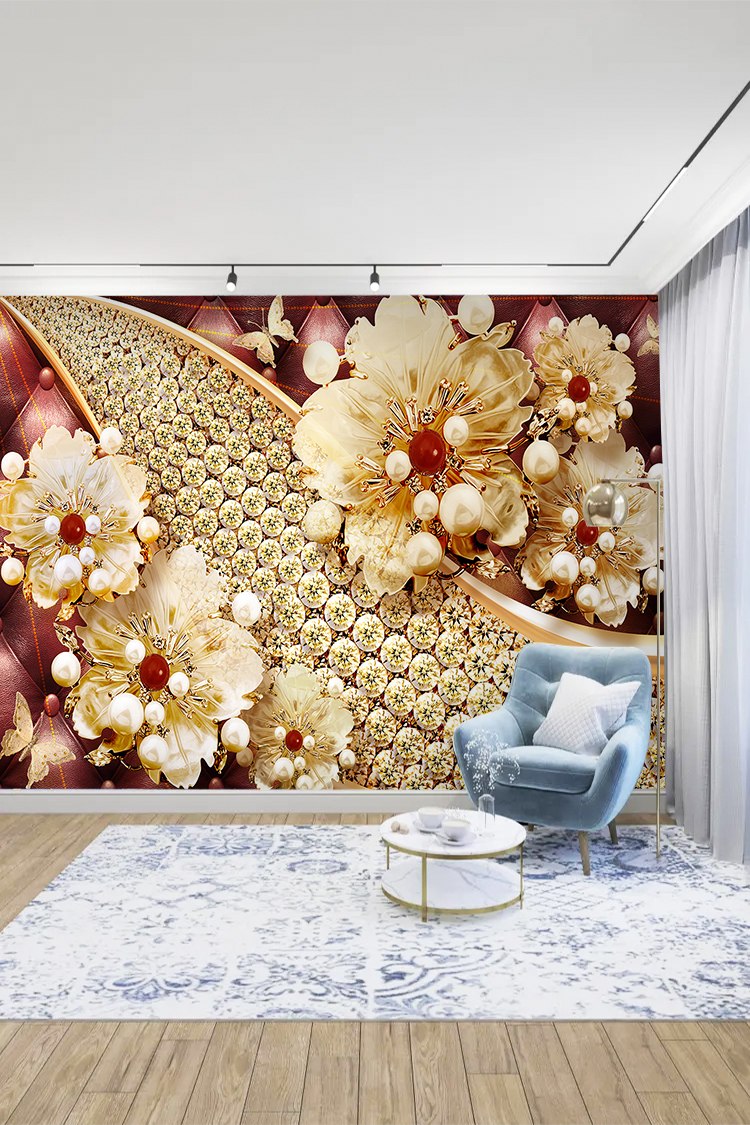 Altın ve İnci Detaylı Çiçek Desenli Duvar Kağıdı