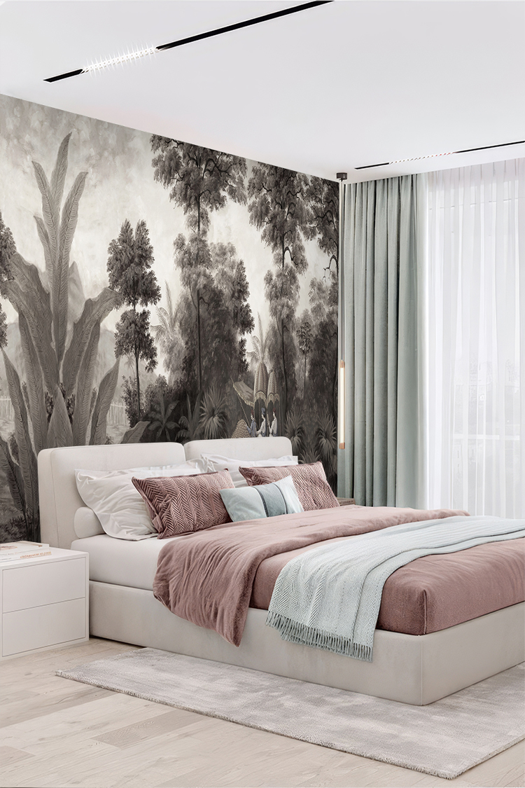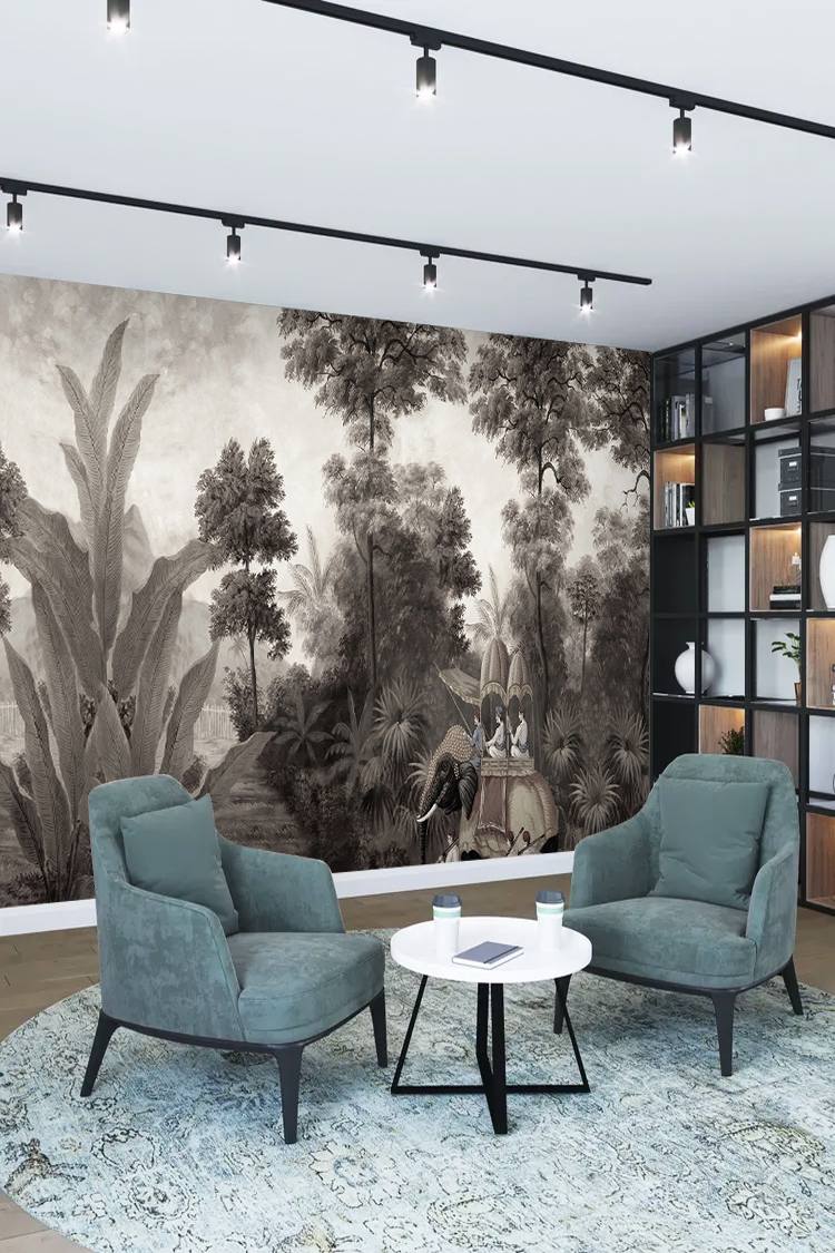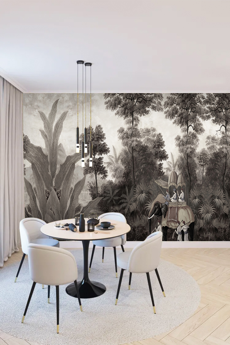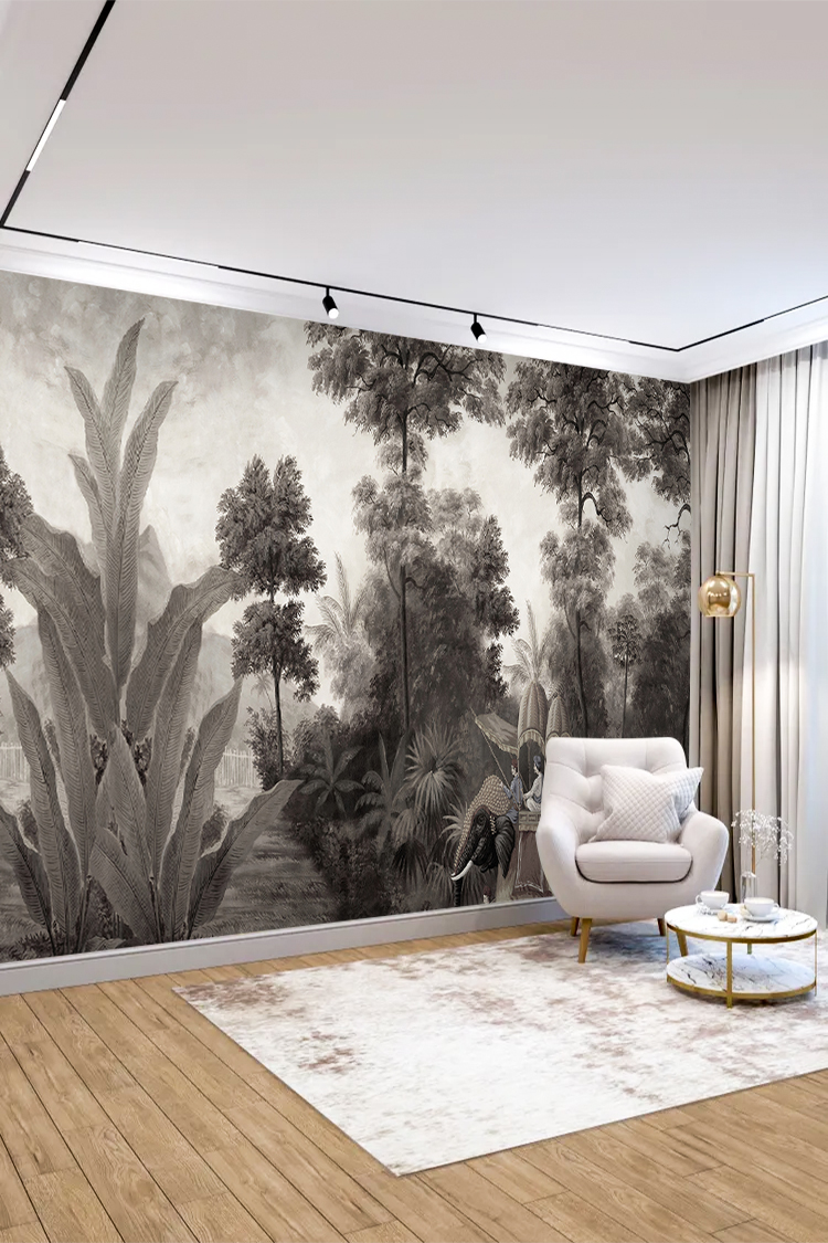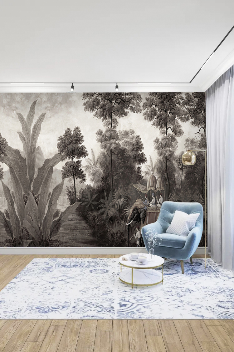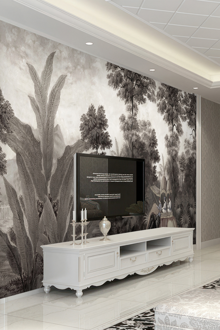 Antik Tropikal Manzara ve Binici Desenli Siyah Beyaz Duvar Kağıdı
