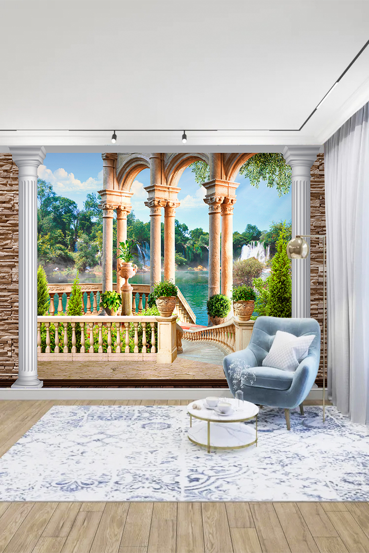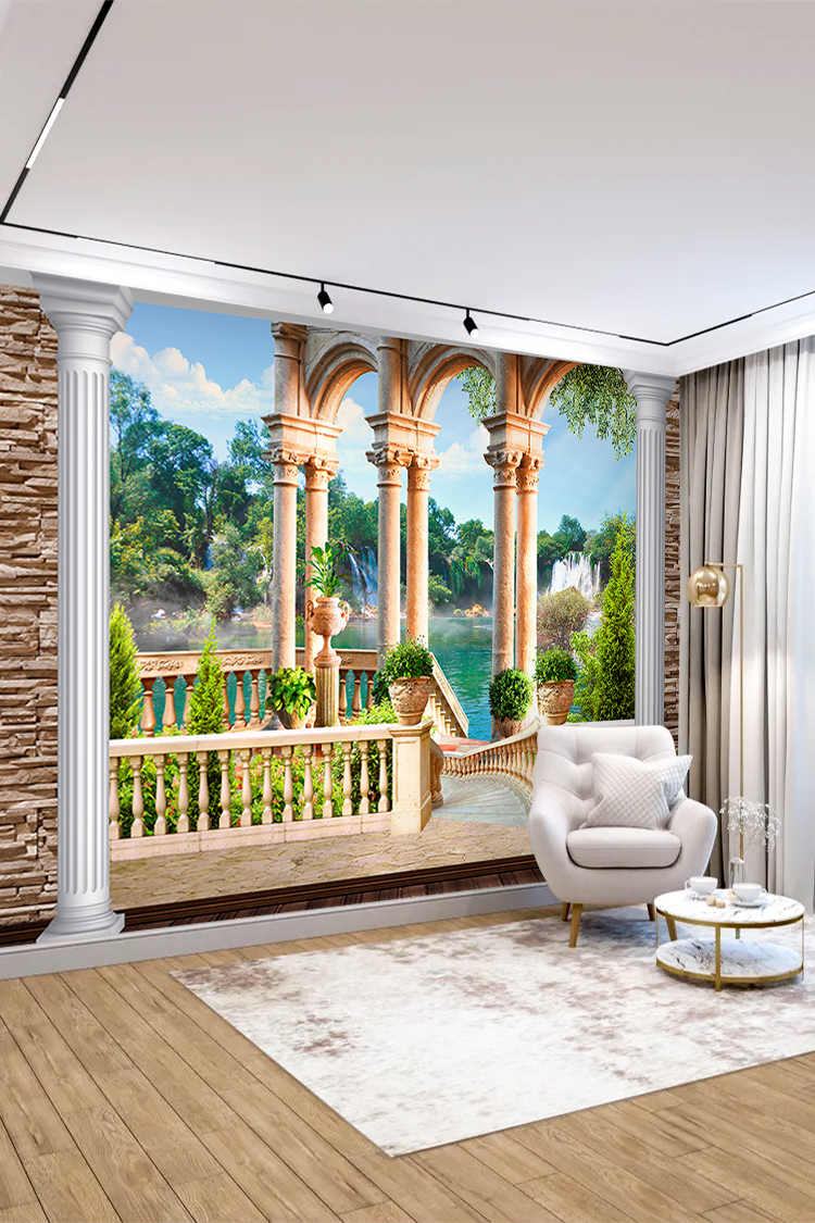 Balkonlu Şelale ve Doğa Manzarası Duvar Kağıdı