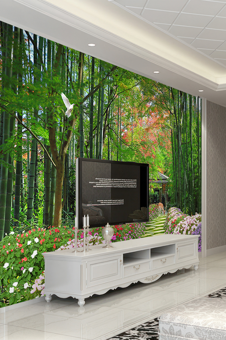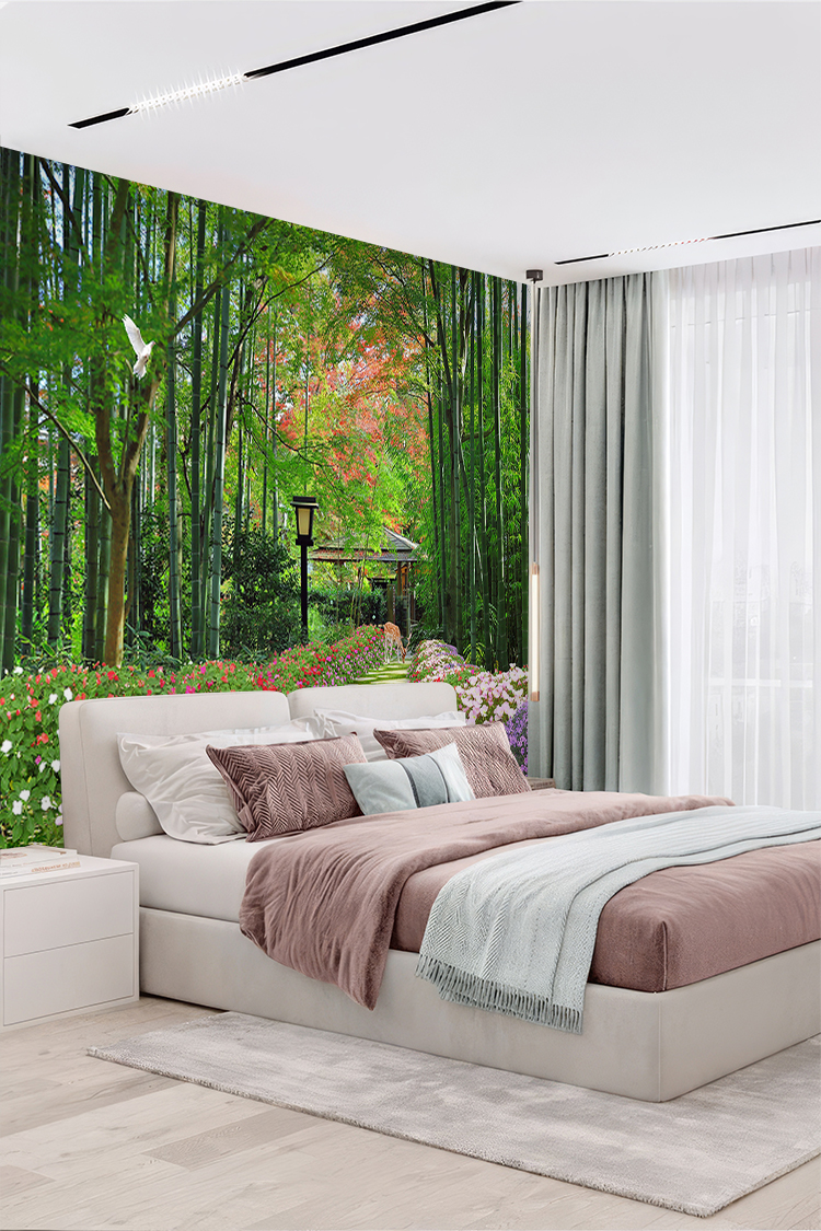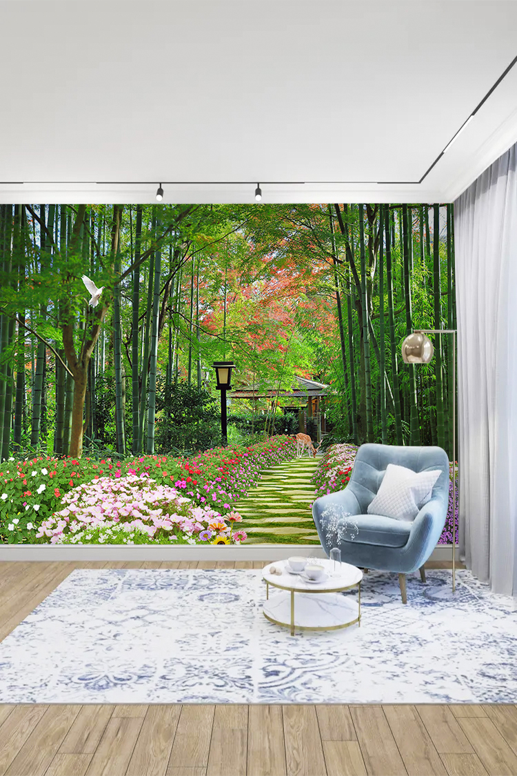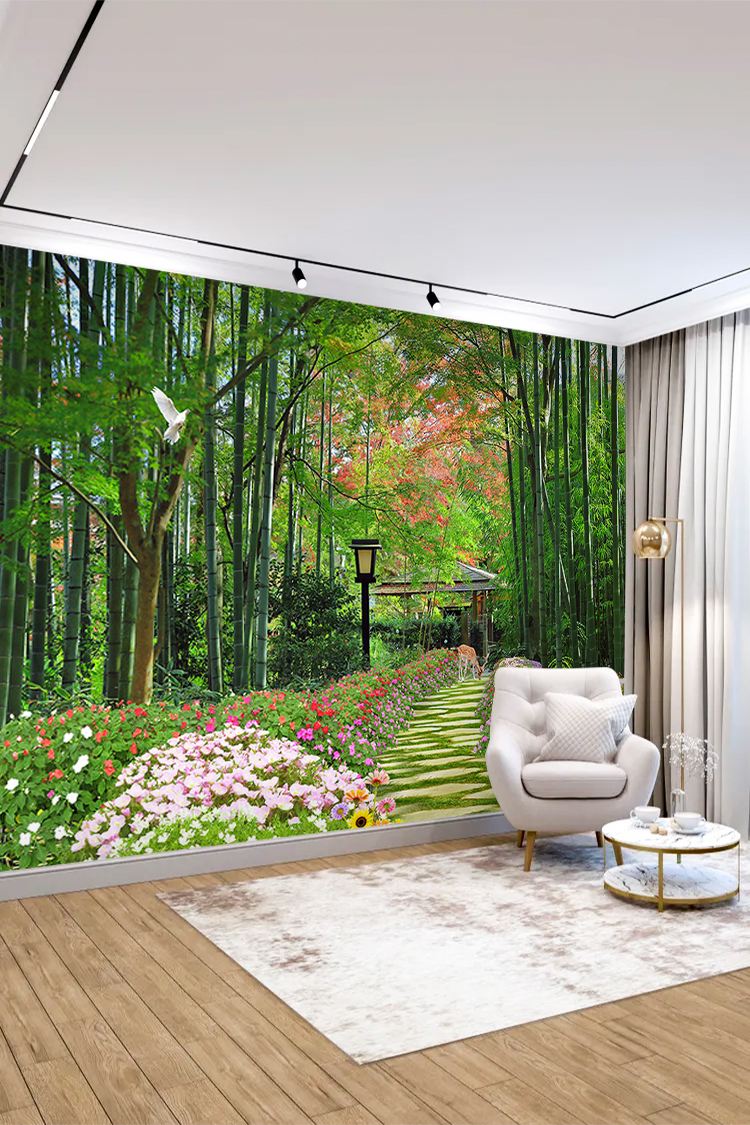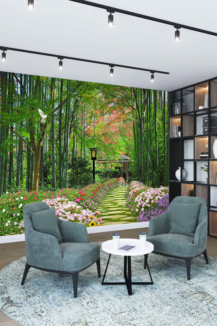 Bambu Ormanı ve Çiçekli Yürüyüş Yolu Duvar Kağıdı