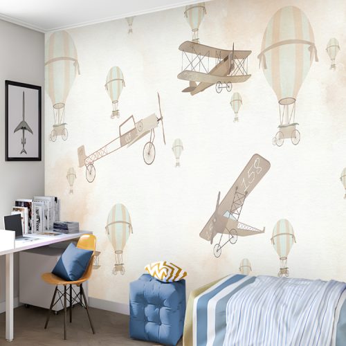 Vintage Uçak ve Uçan Balonlar Duvar Kağıdı