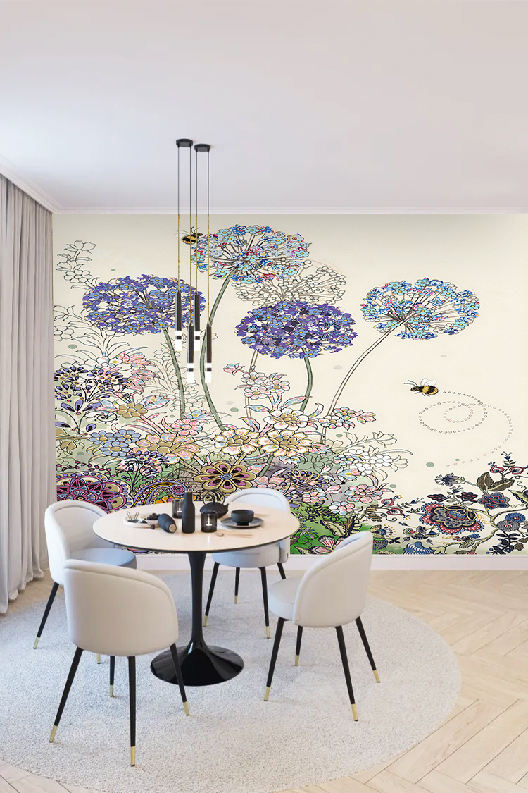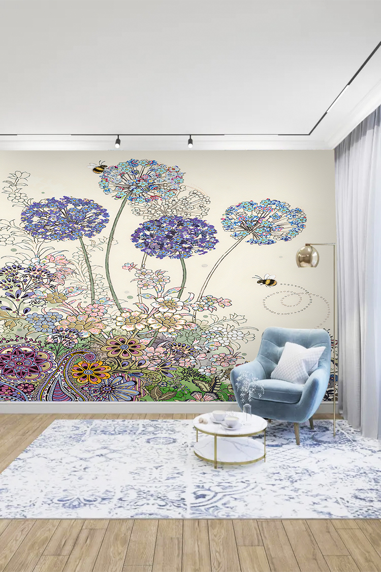 Canlı Çiçek ve Arı Desenli Duvar Kağıdı