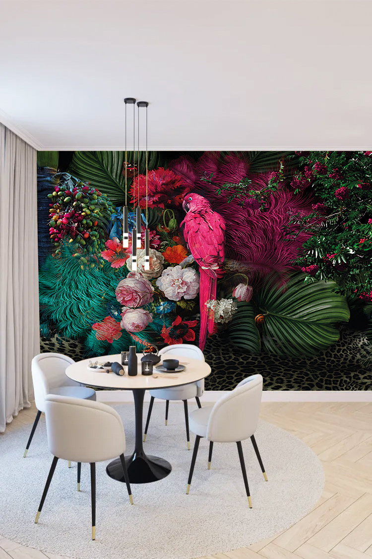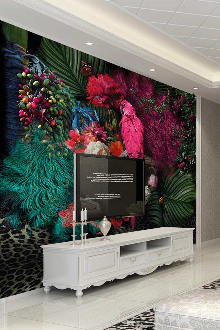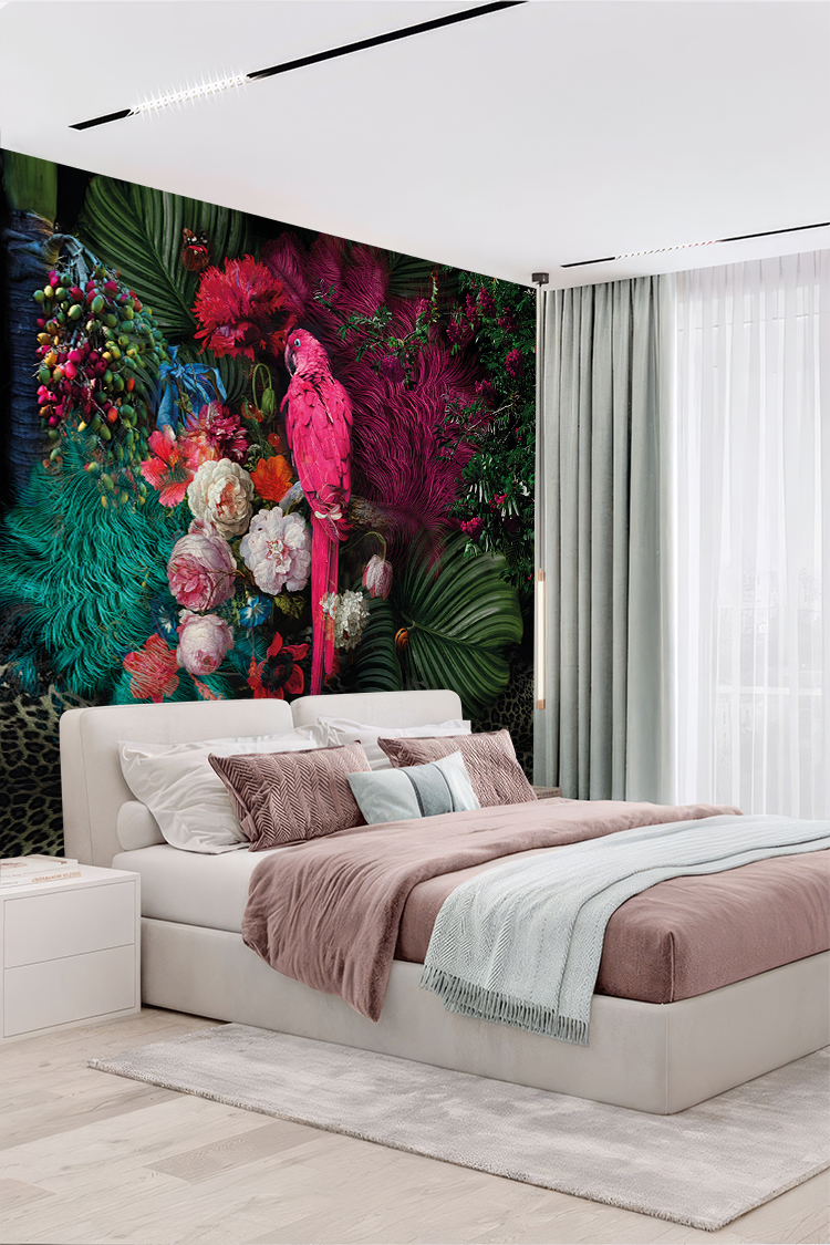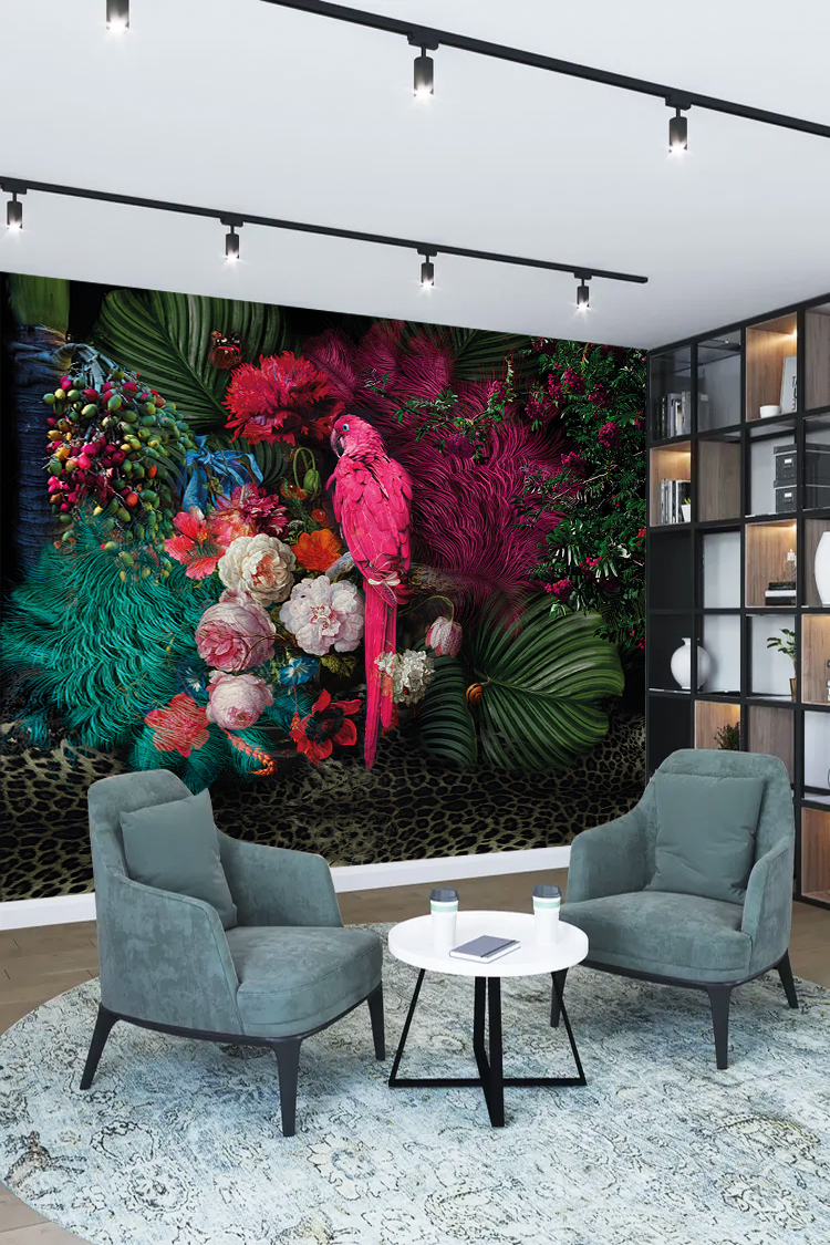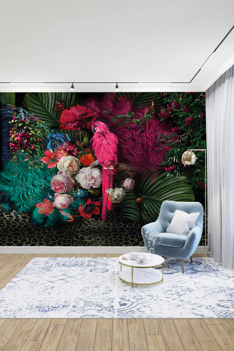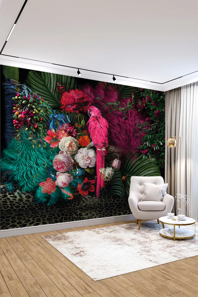 Canlı Tropikal Bitkiler ve Kuşlu Duvar Kağıdı