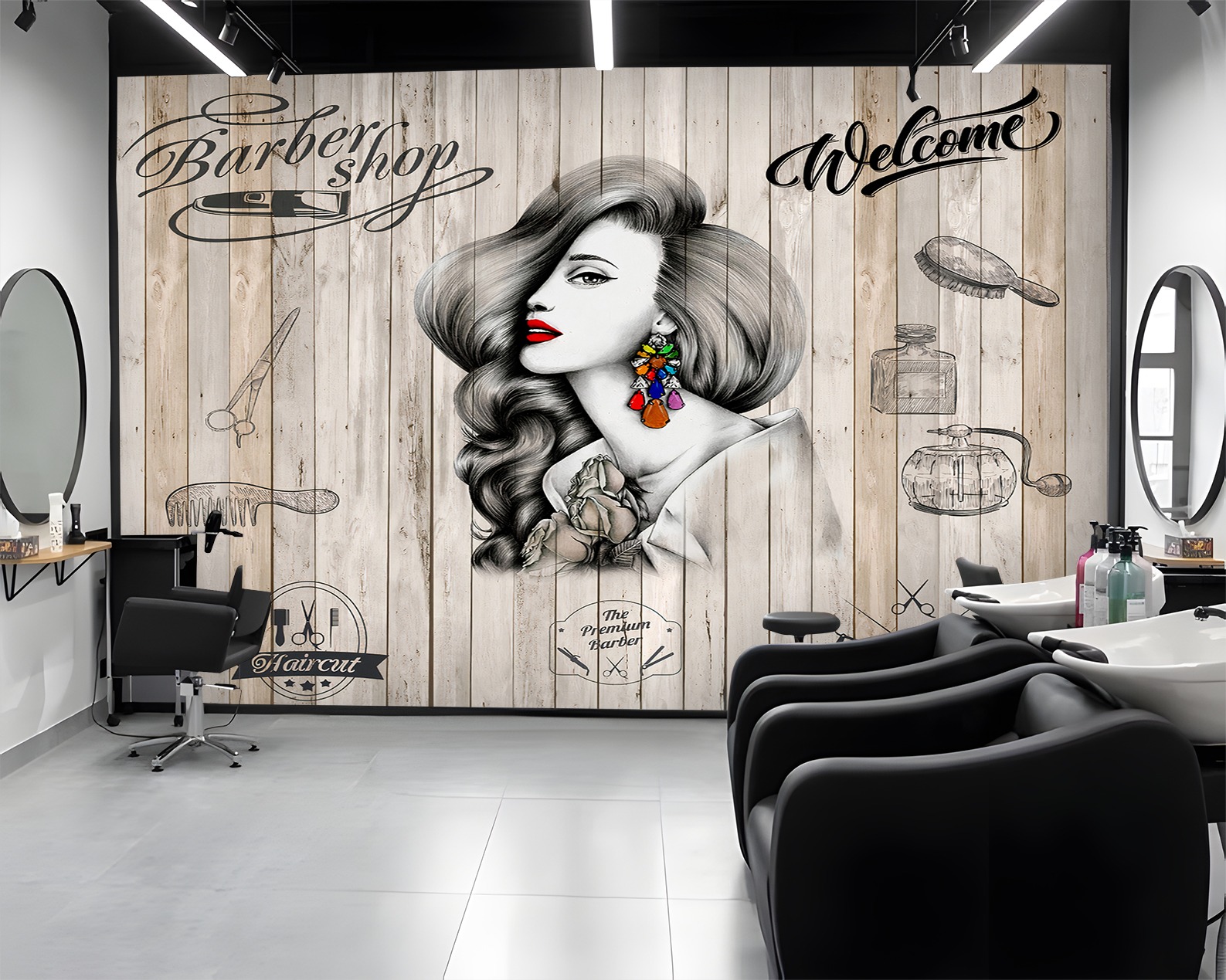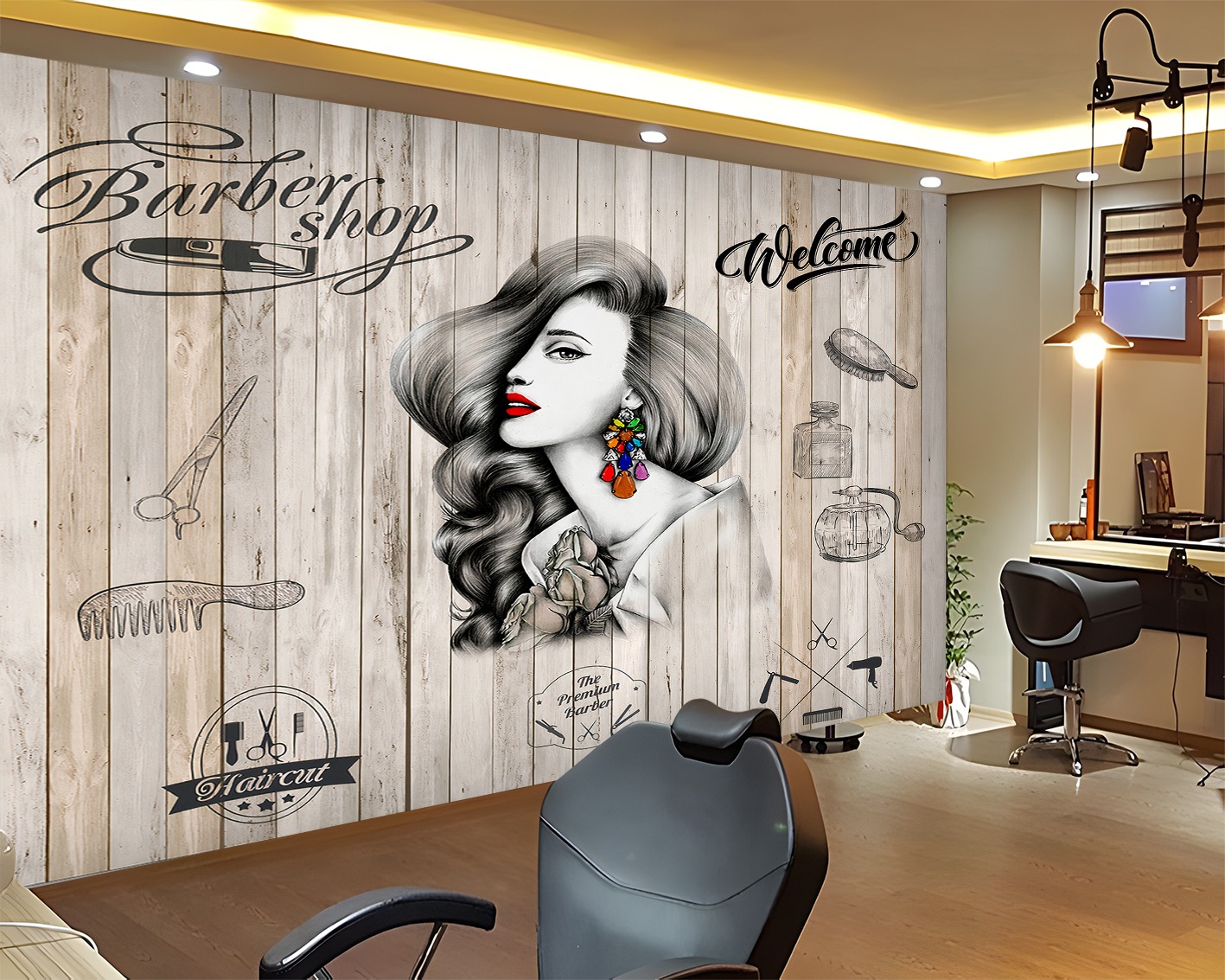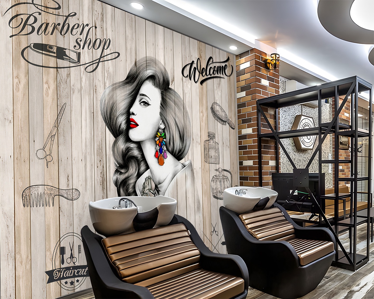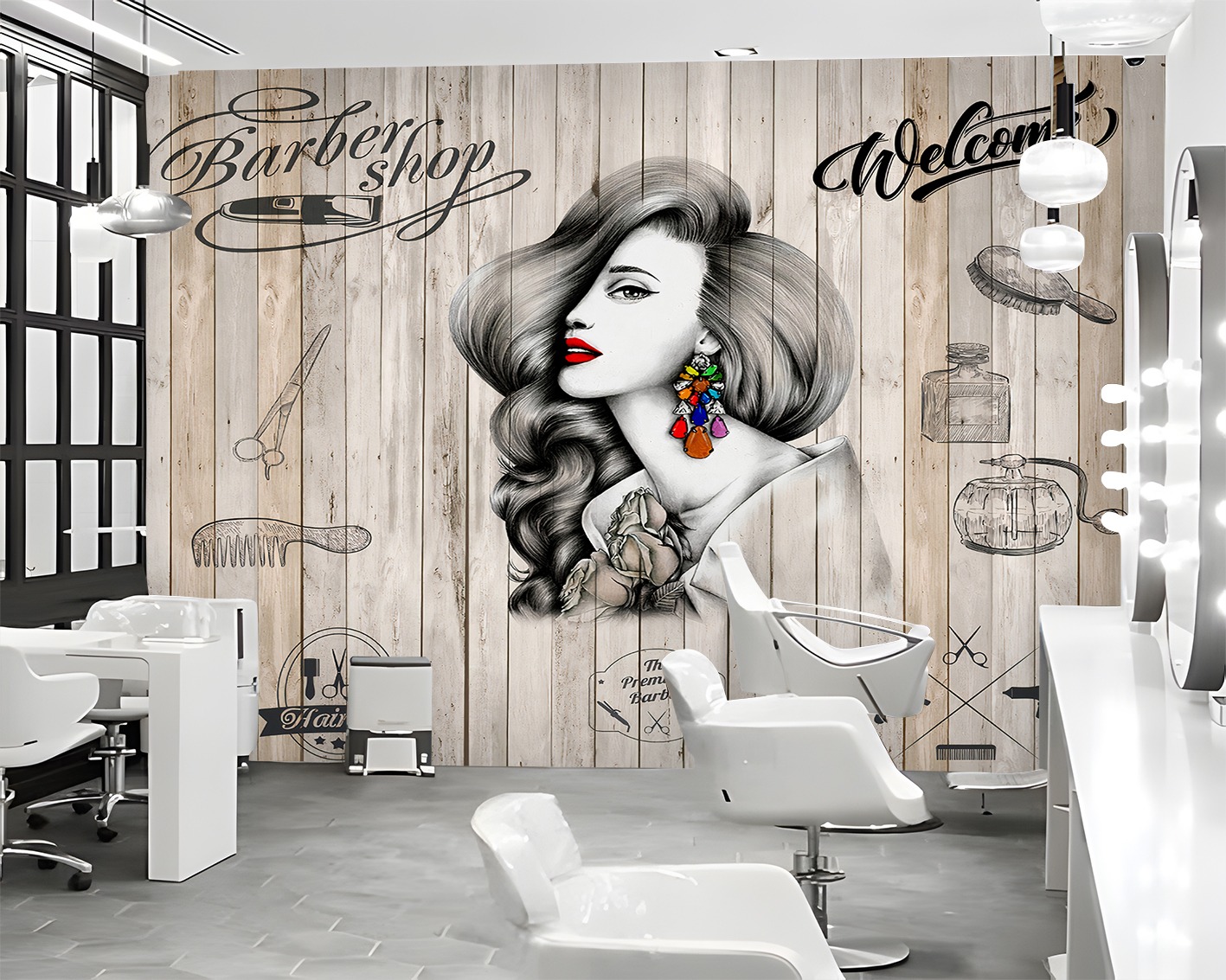Çekici Kadın ve Kuaför Temalı Ahşap Desen Duvar Kağıdı