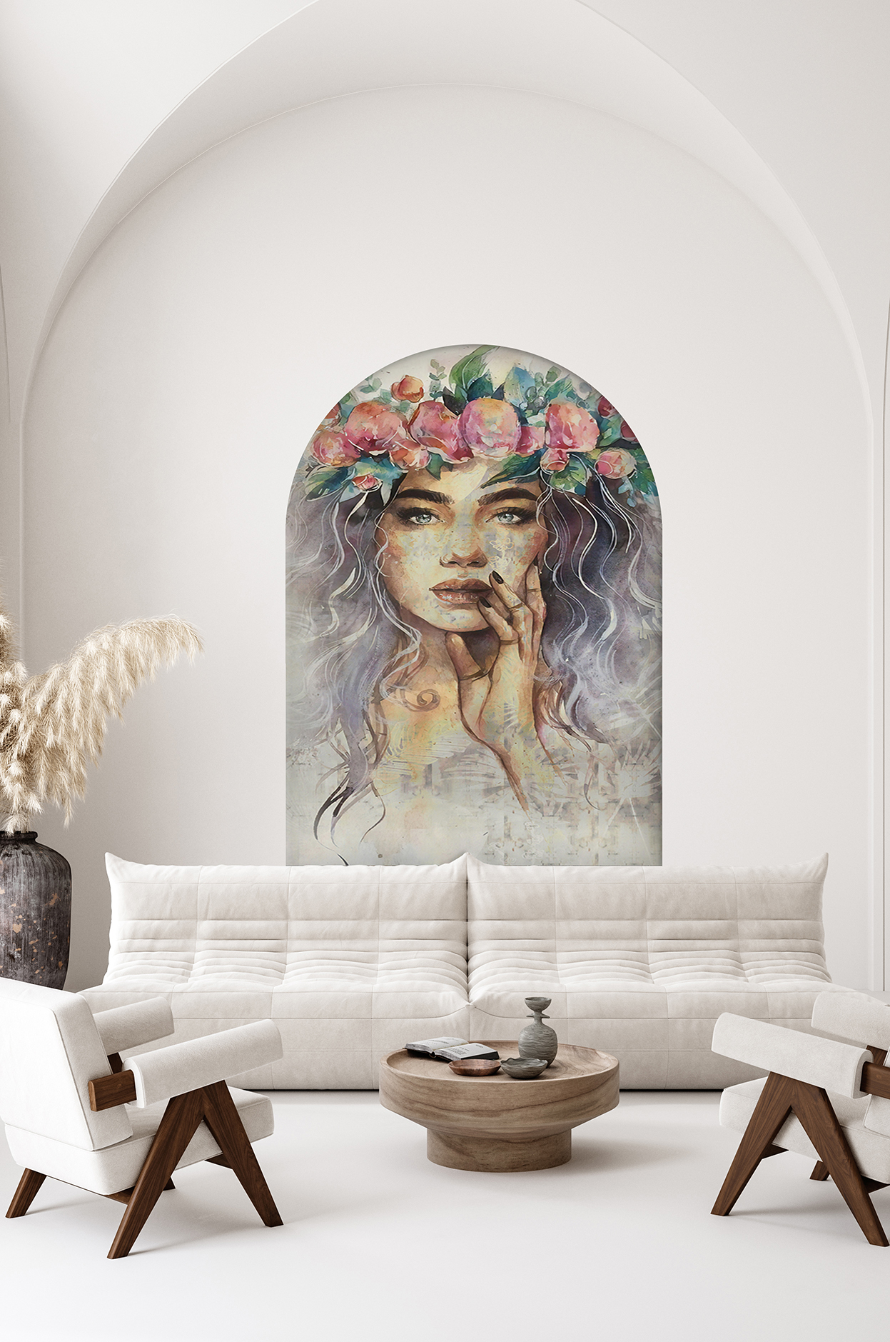 Çiçek Taçlı Kadın Figürlü Duvar Kağıdı – Renkli ve Zarif İç Mekan Tasarımı 🎨🚂