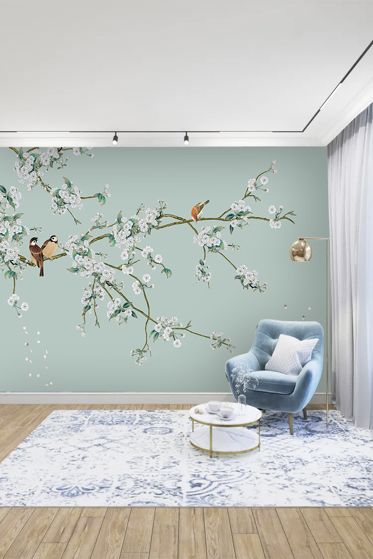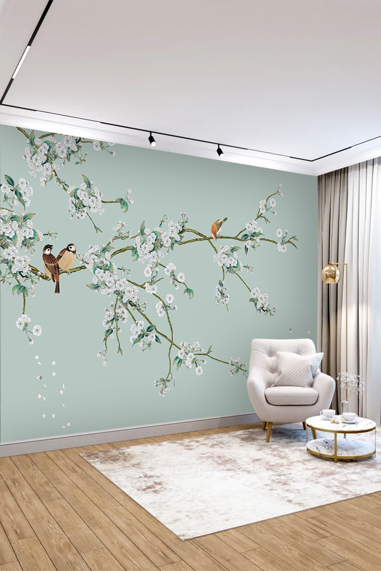 Çiçekli Kuş Desenli Duvar Kağıdı