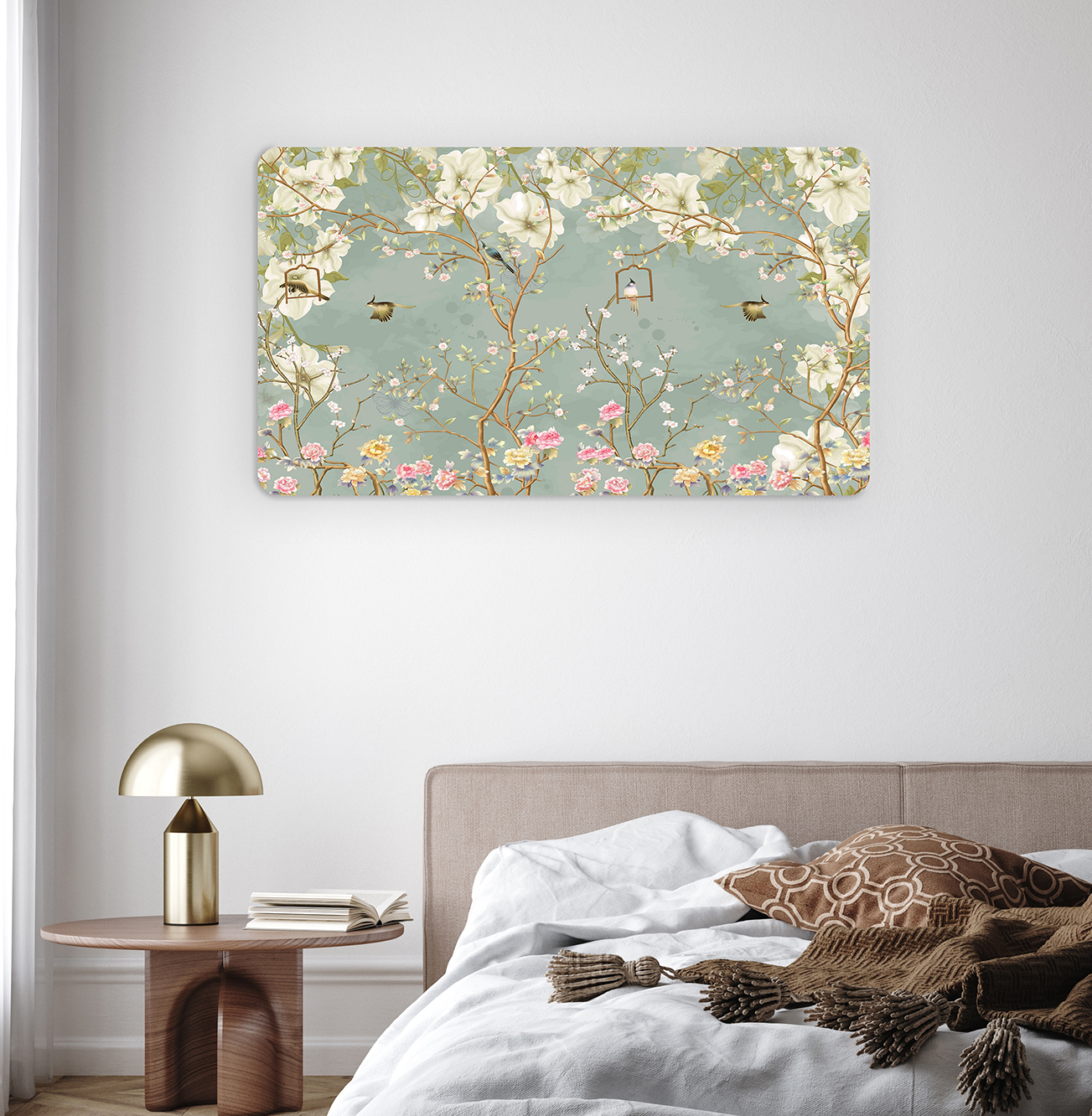 Çiçekli Kuşlar Duvar Kağıdı – Pastel Yeşil Arka Plan ve Zarif Tasarım 🎨🚂