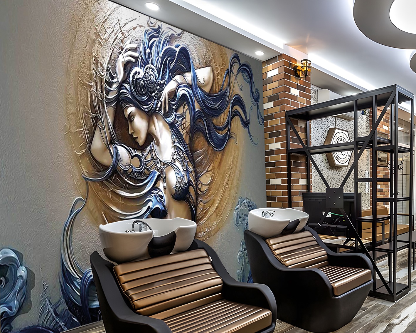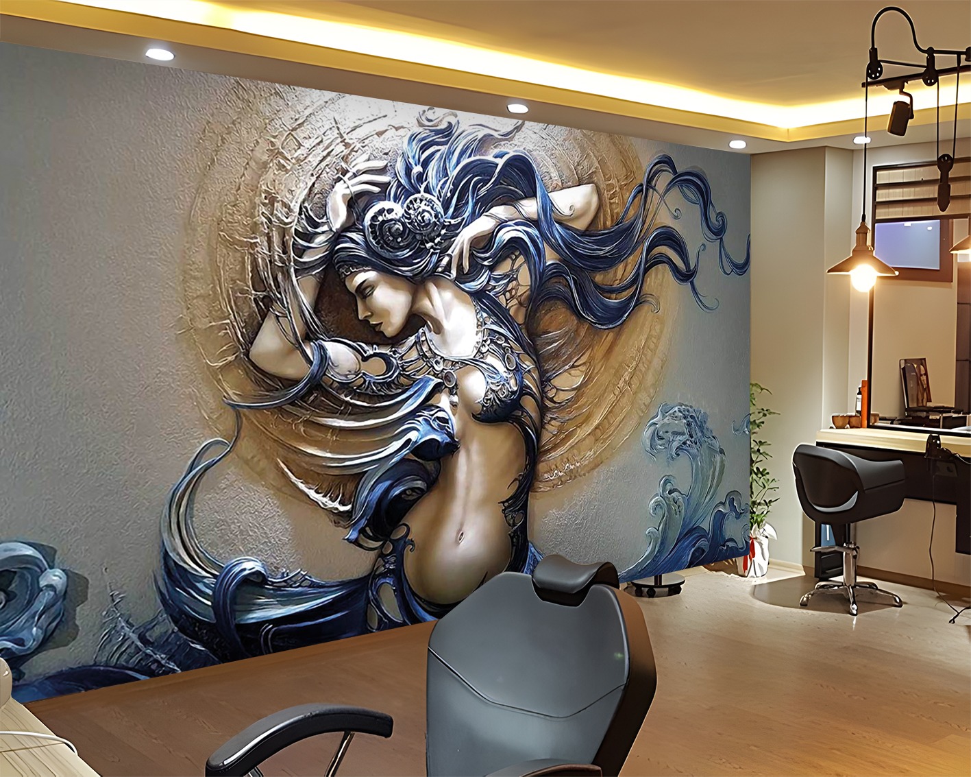 Deniz Kızı Kabartmalı ve Dalgalı Desen Duvar Kağıdı
