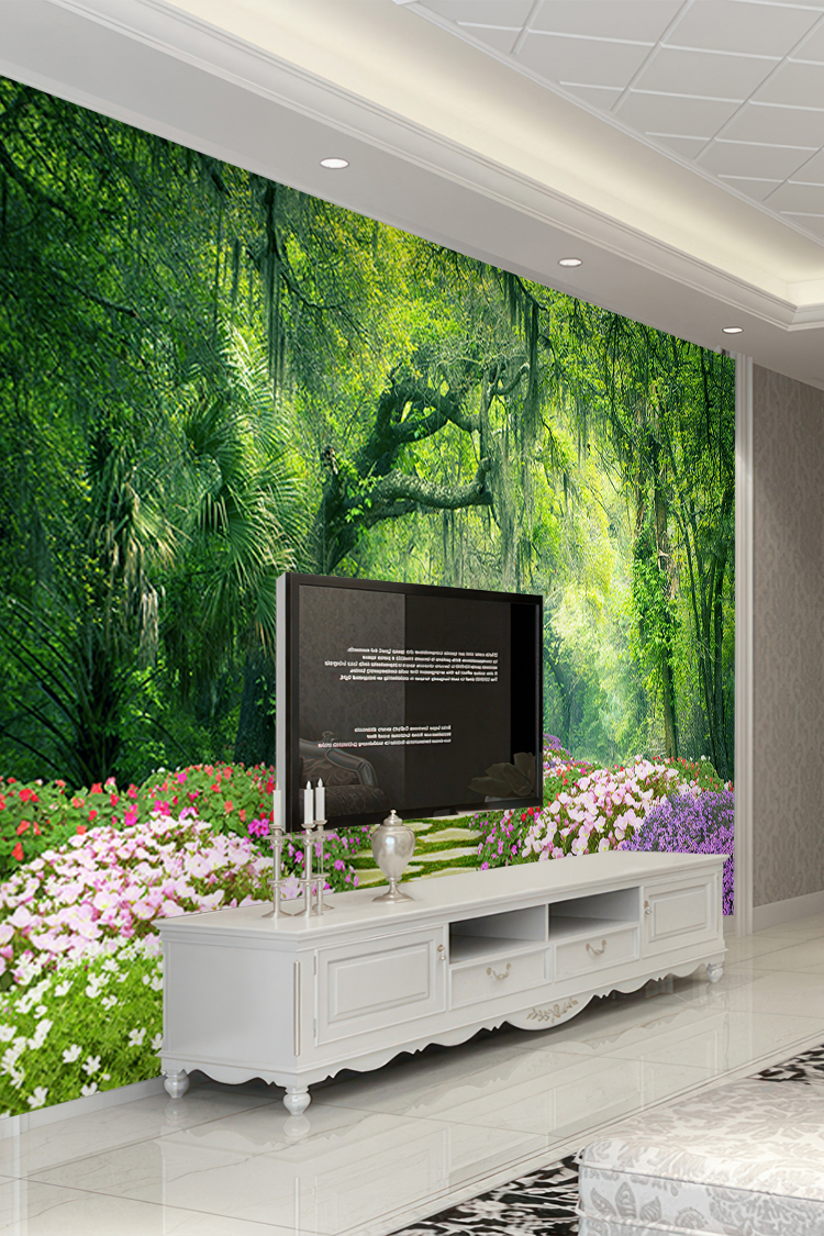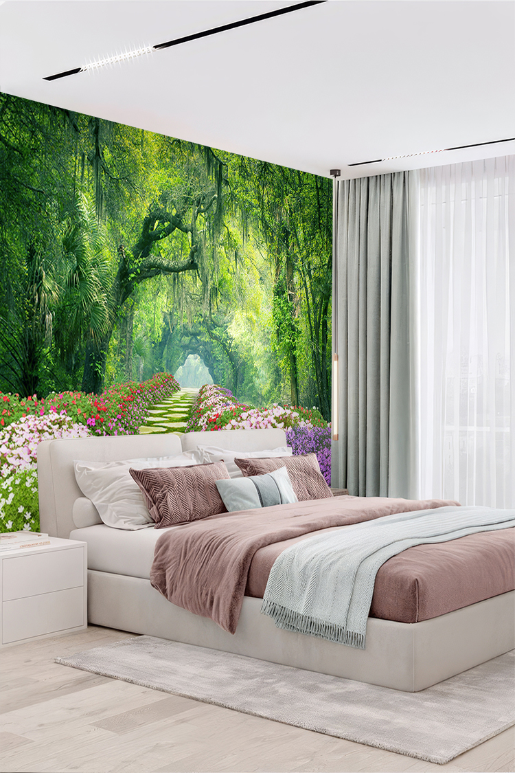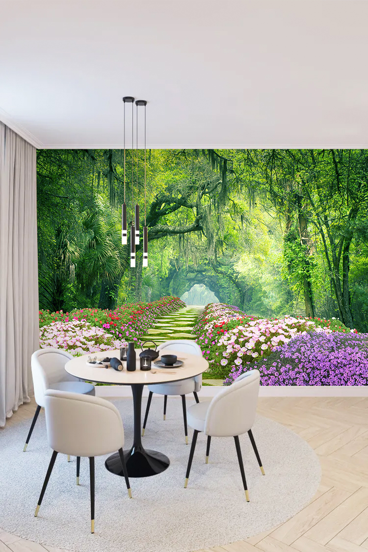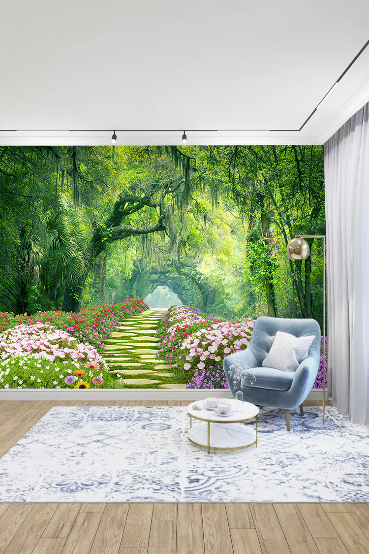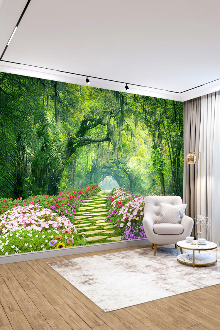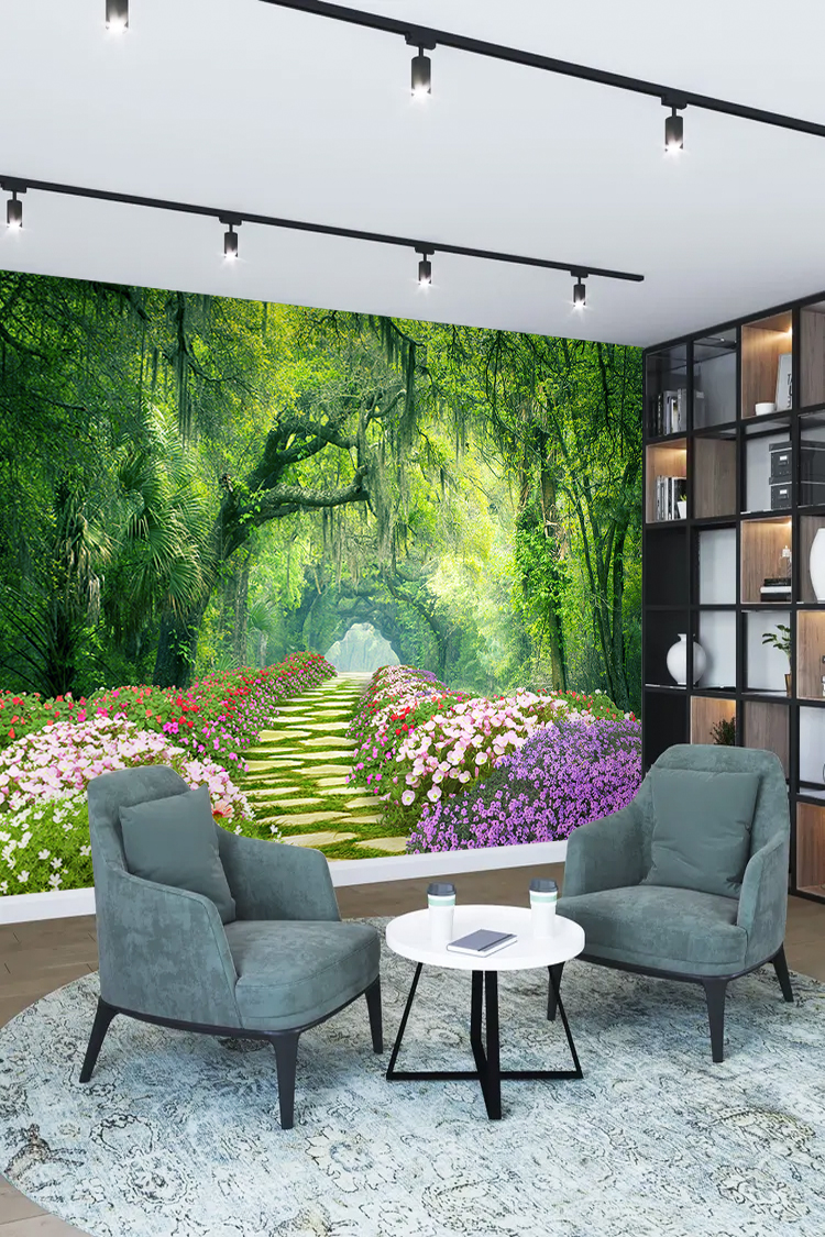 Doğal Orman Yolu ve Çiçek Desenli Duvar Kağıdı