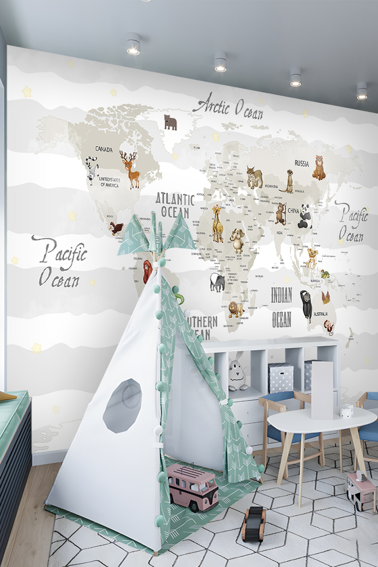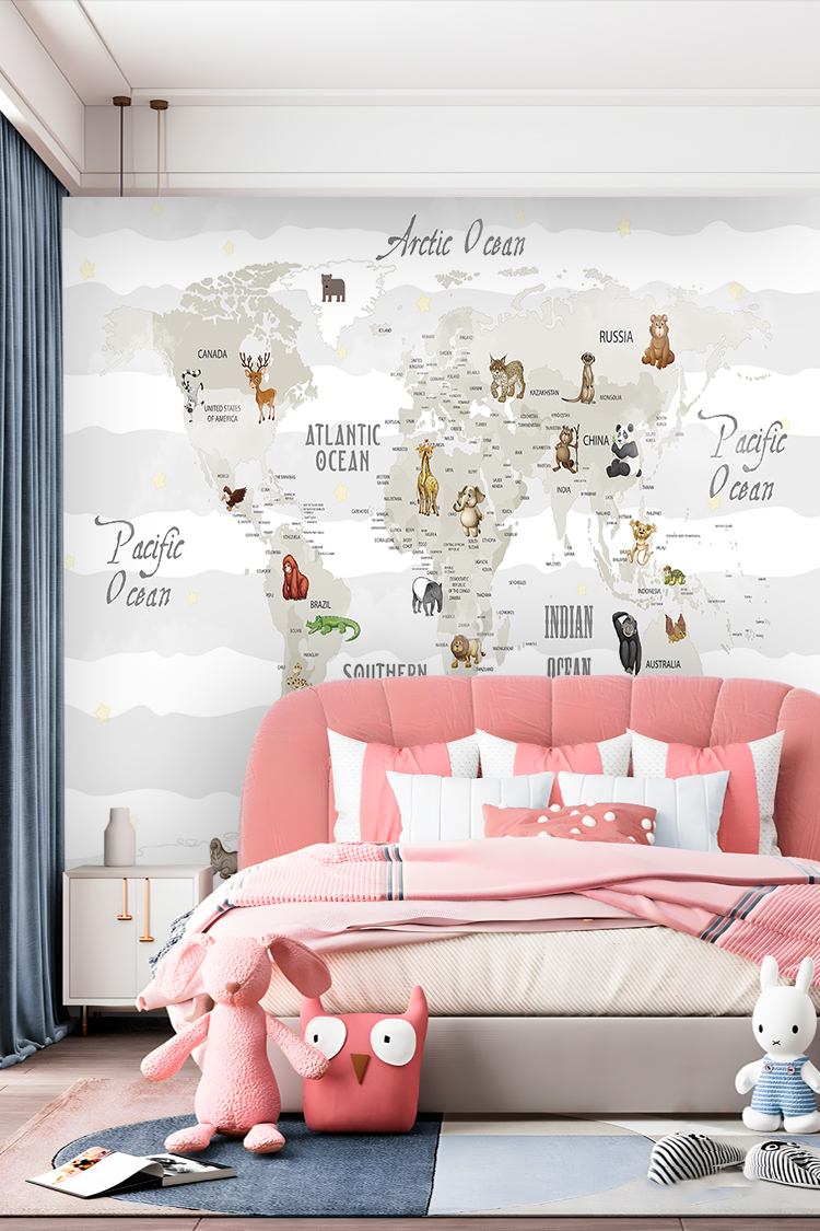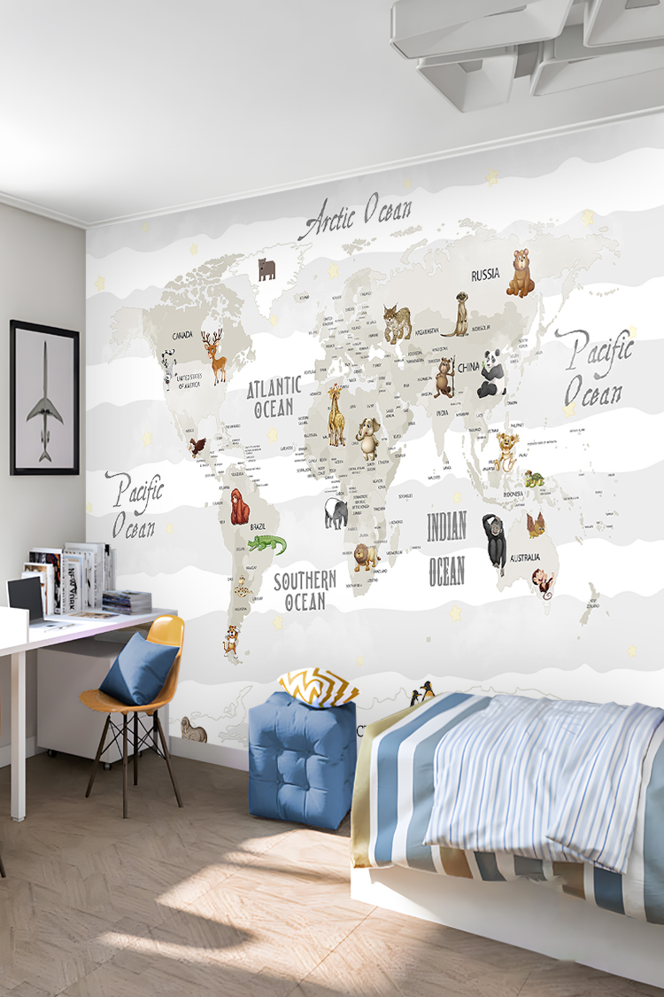 Dünya Haritası ve Hayvanlar Temalı Duvar Kağıdı