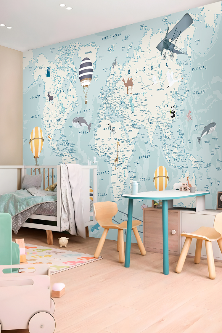 Dünya Haritası ve Hayvanlar Temalı Duvar Kağıdı