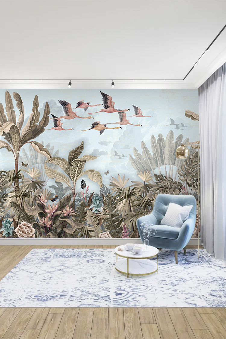 Egzotik Flamingolar ve Tropikal Bitkilerle Doğa Temalı Duvar Kağıdı