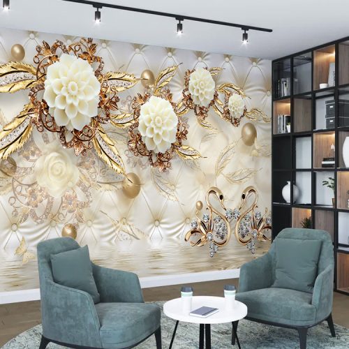 Zarif Altın Çiçek ve Kuğu Desenli Lüks Duvar Kağıdı