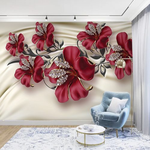 Zarif Kırmızı Çiçek ve Altın Desenli Lüks Duvar Kağıdı