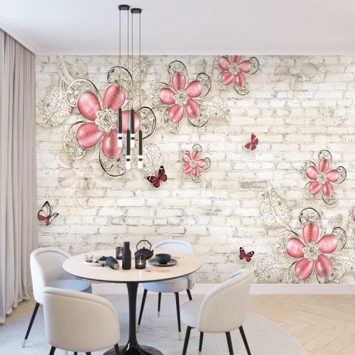 Zarif Pembe Çiçek ve Kelebek Desenli Lüks Duvar Kağıdı