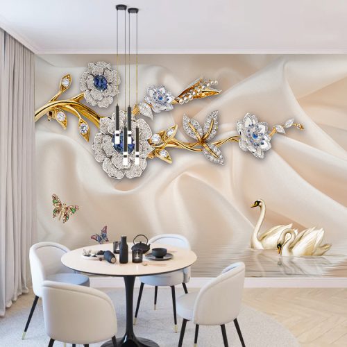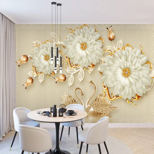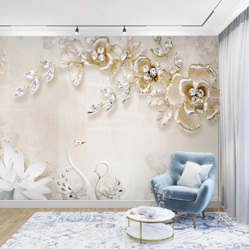 Zarif Çiçek ve Kuğu Desenli Lüks Duvar Kağıdı