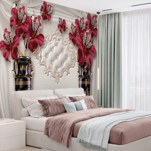 Zarif Kırmızı Çiçek Desenli Lüks Duvar Kağıdı