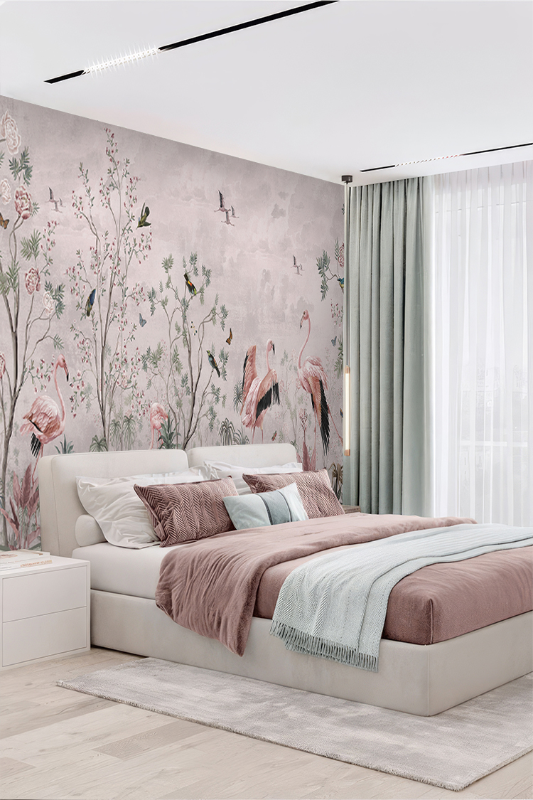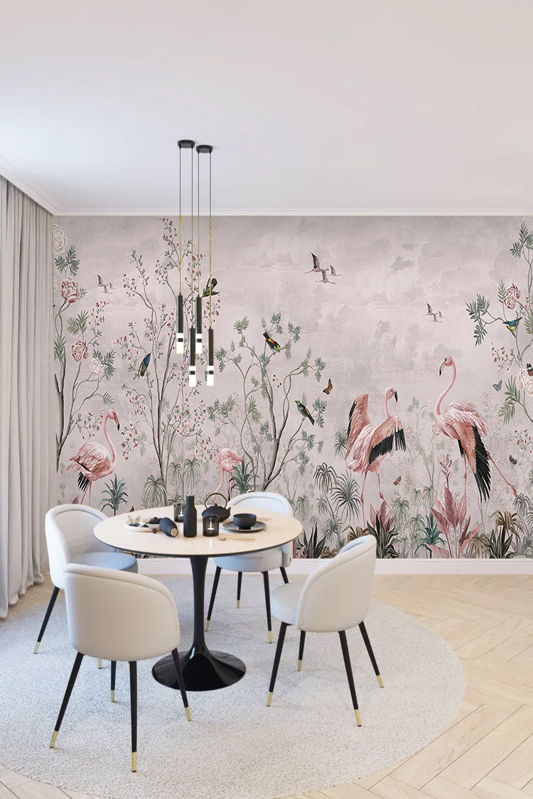 Flamingo ve Doğal Çiçek Desenli Duvar Kağıdı