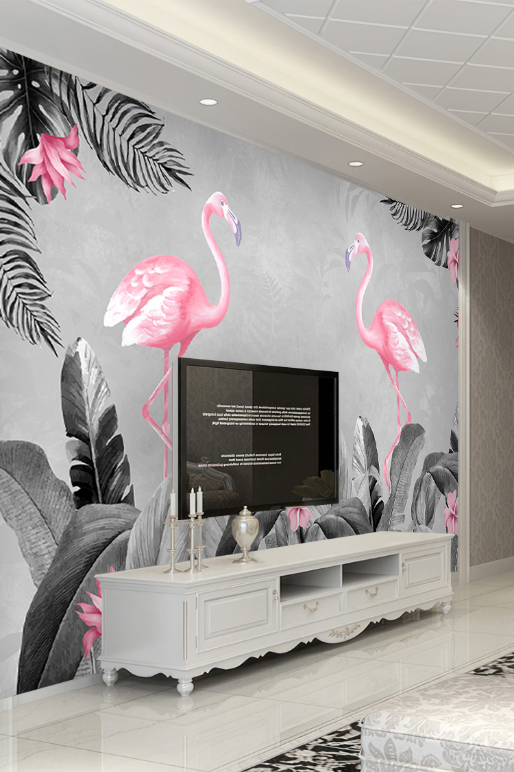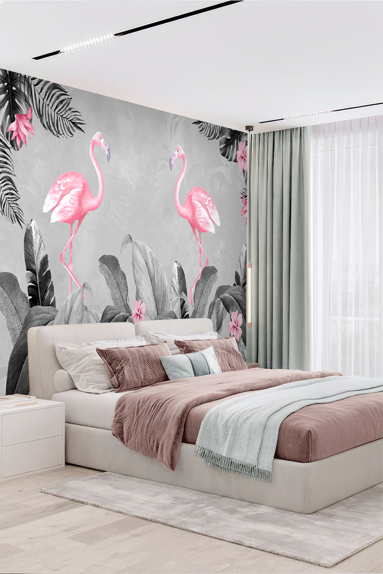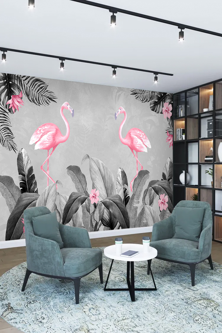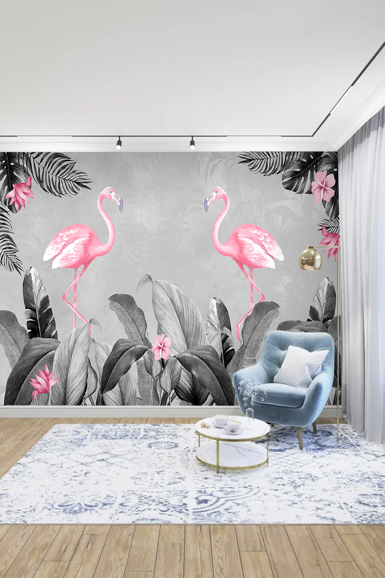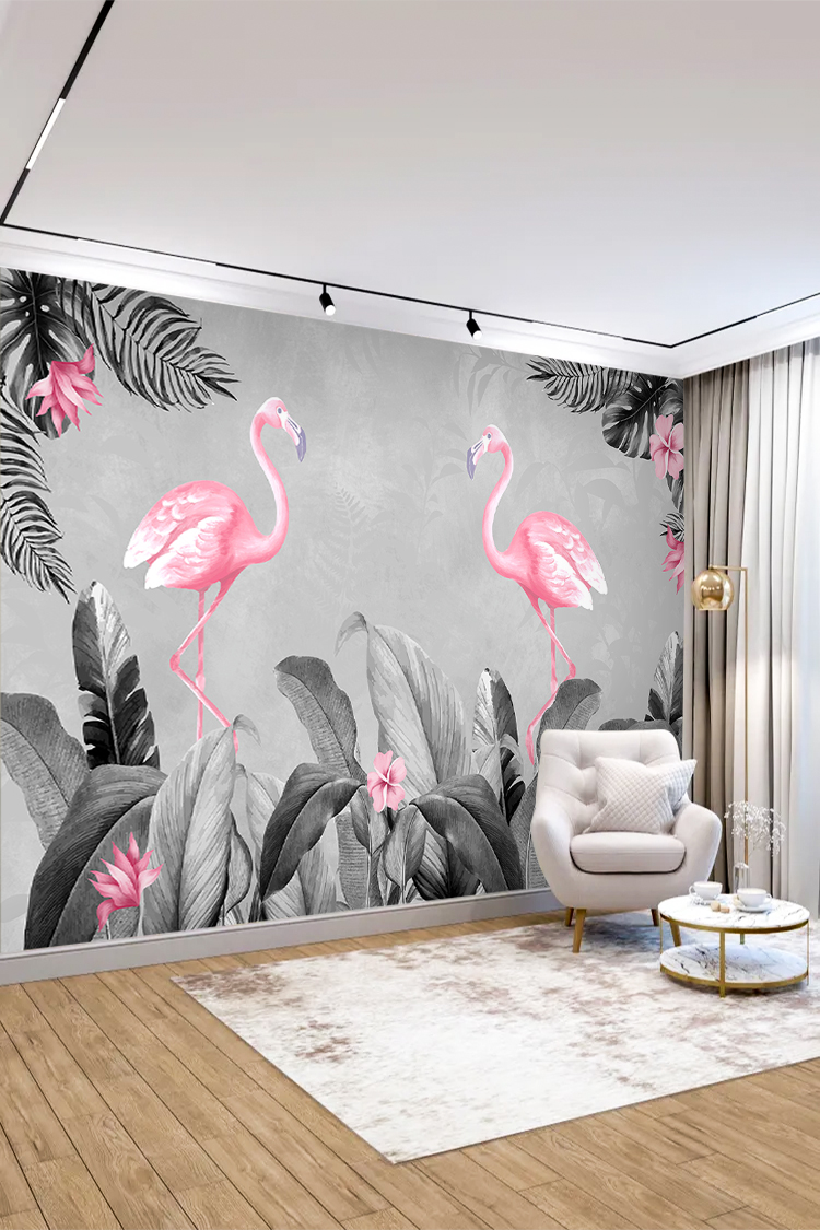 Flamingo ve Tropikal Yaprak Desenli Duvar Kağıdı
