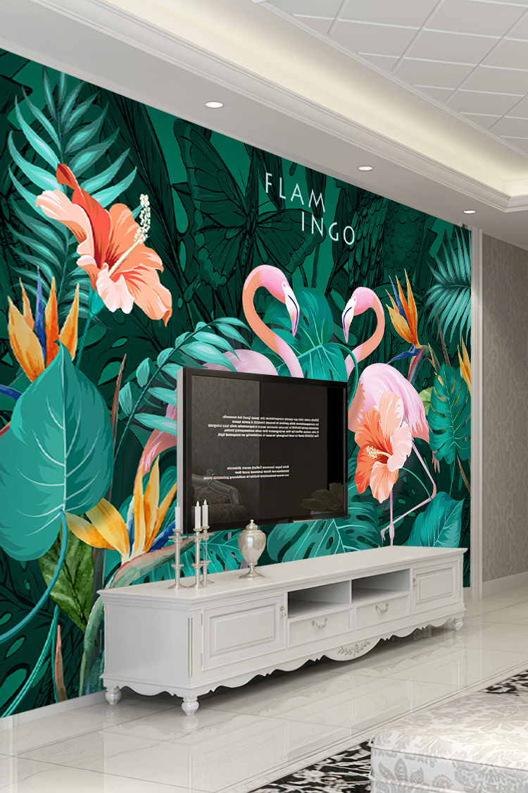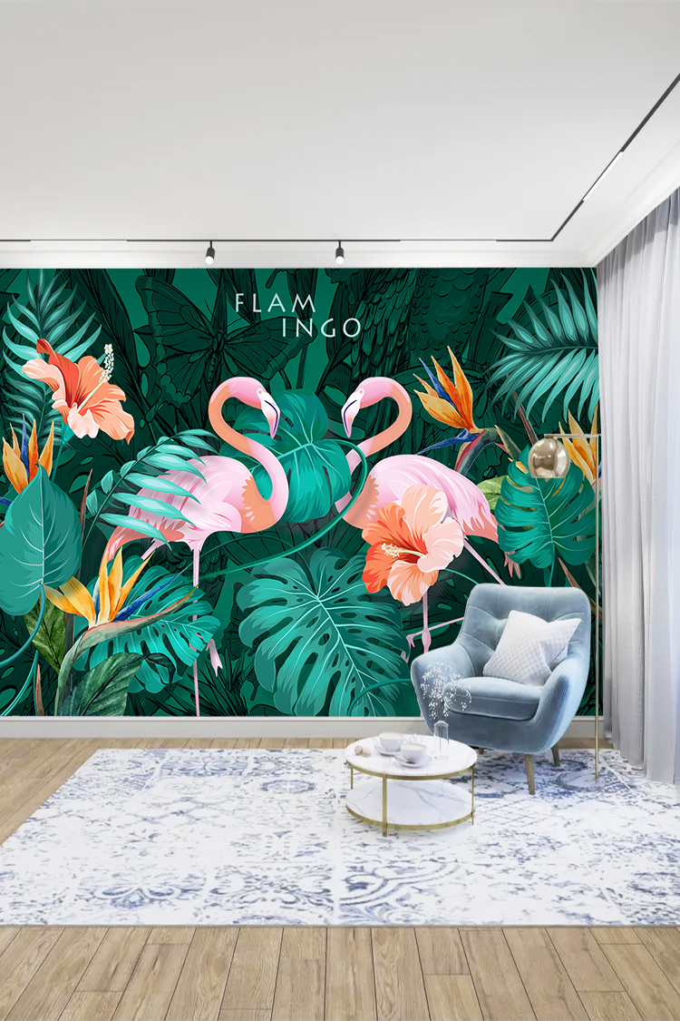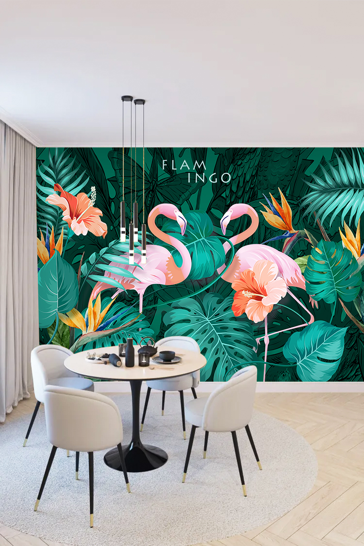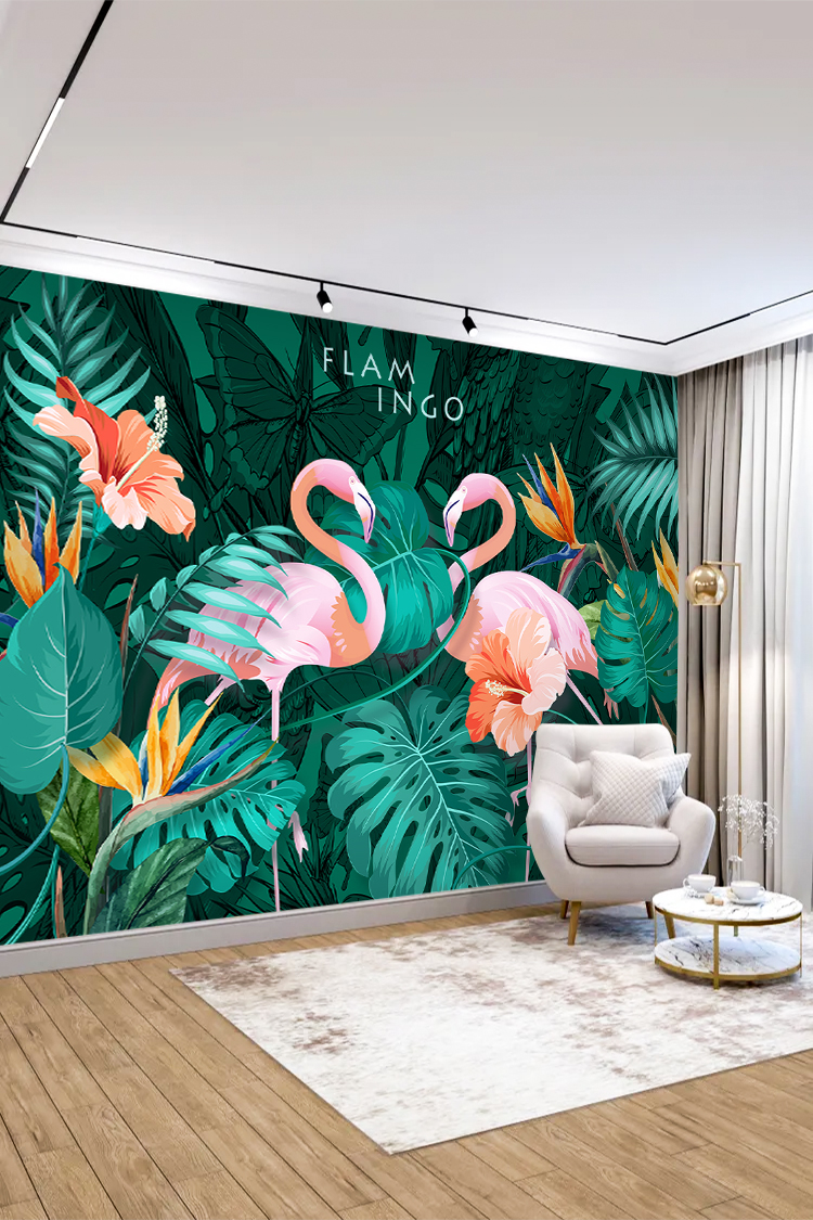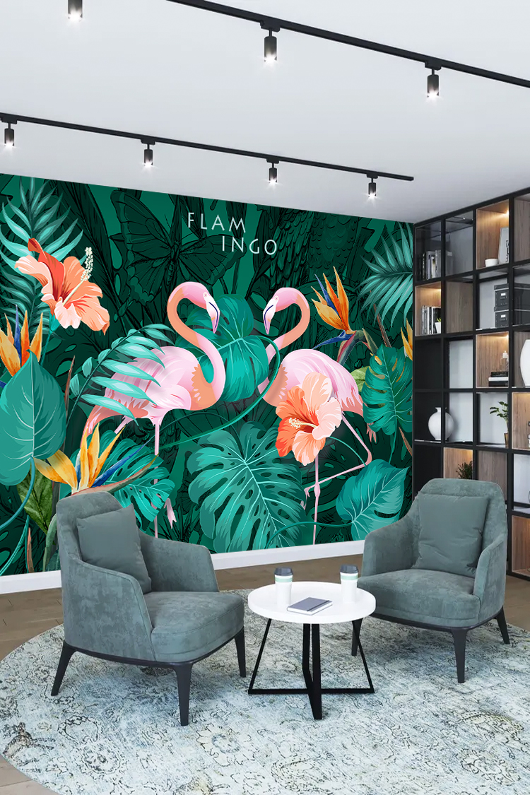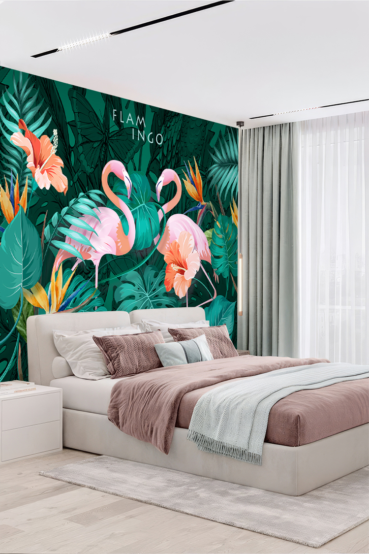 Flamingo ve Tropikal Yapraklar ile Canlı Duvar Kağıdı