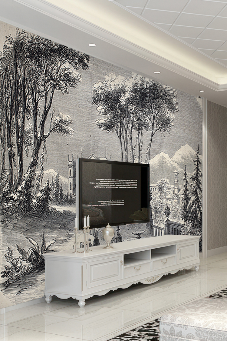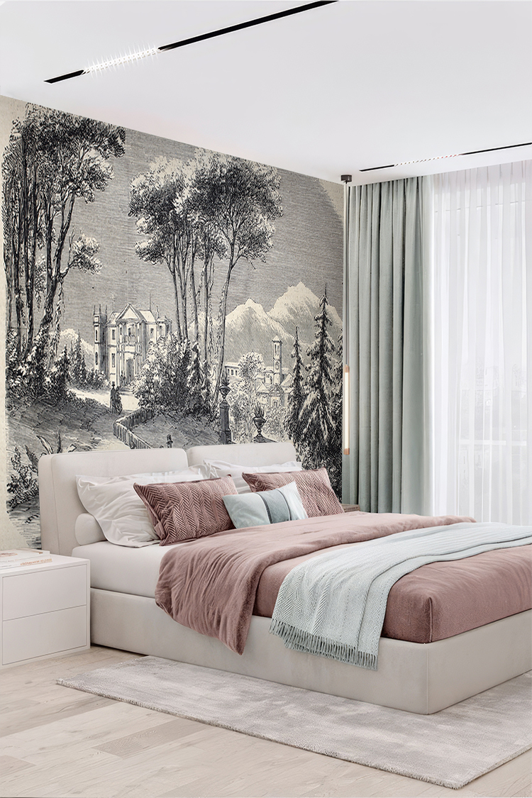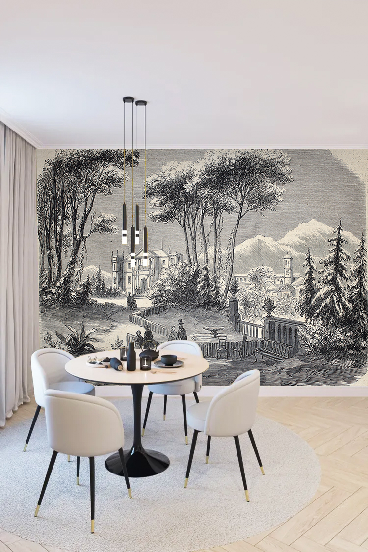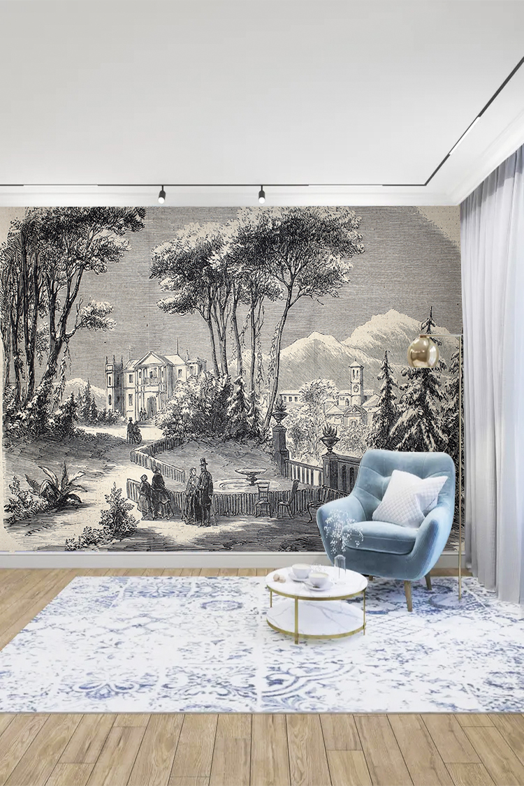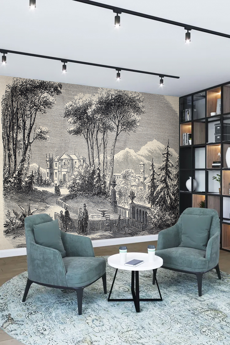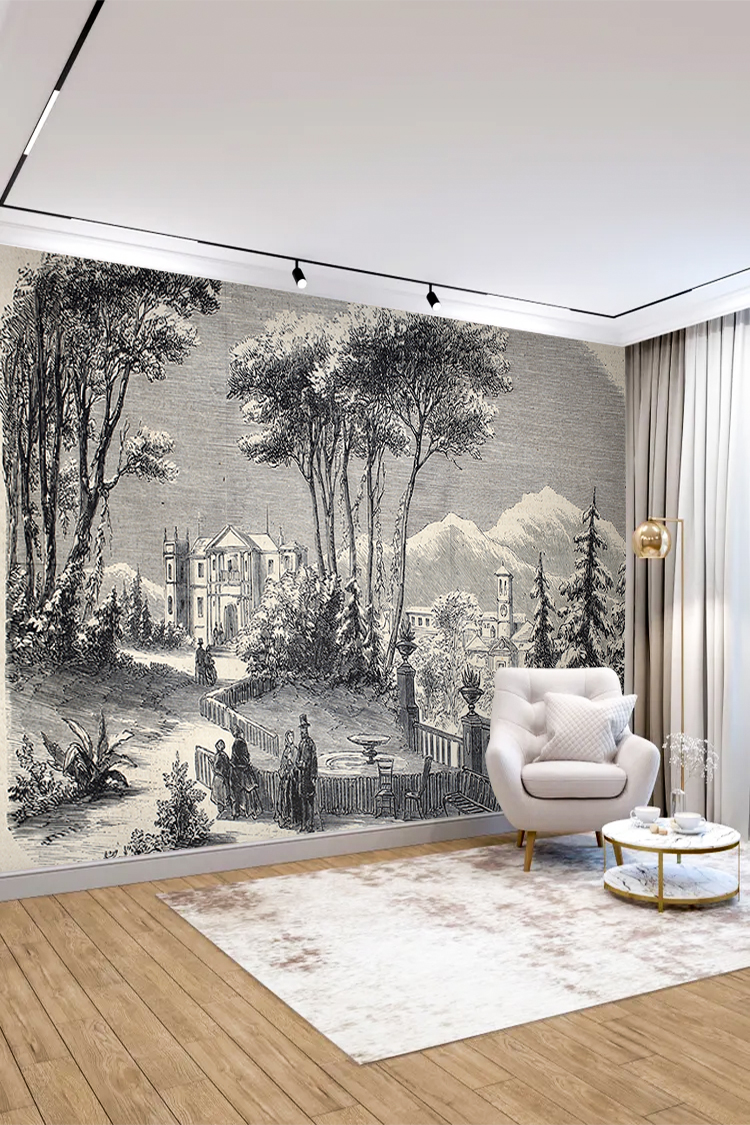 Gravür Tarzı Dağ ve Konak Manzaralı Duvar Kağıdı