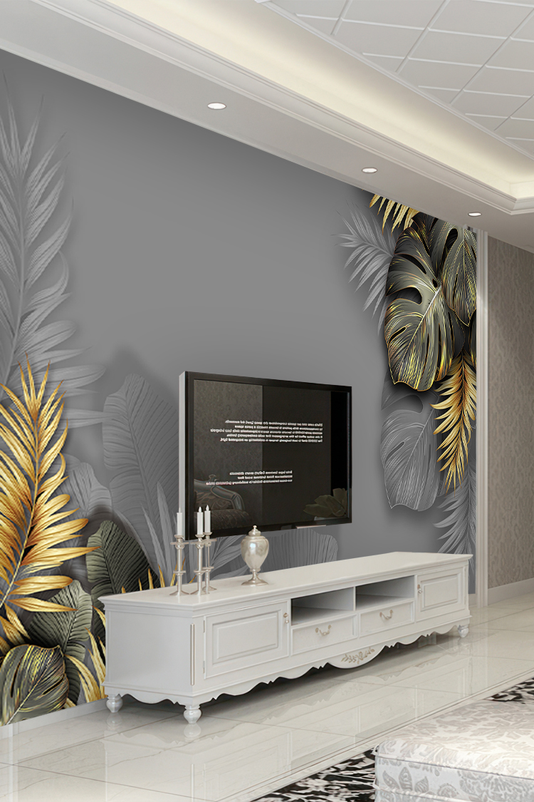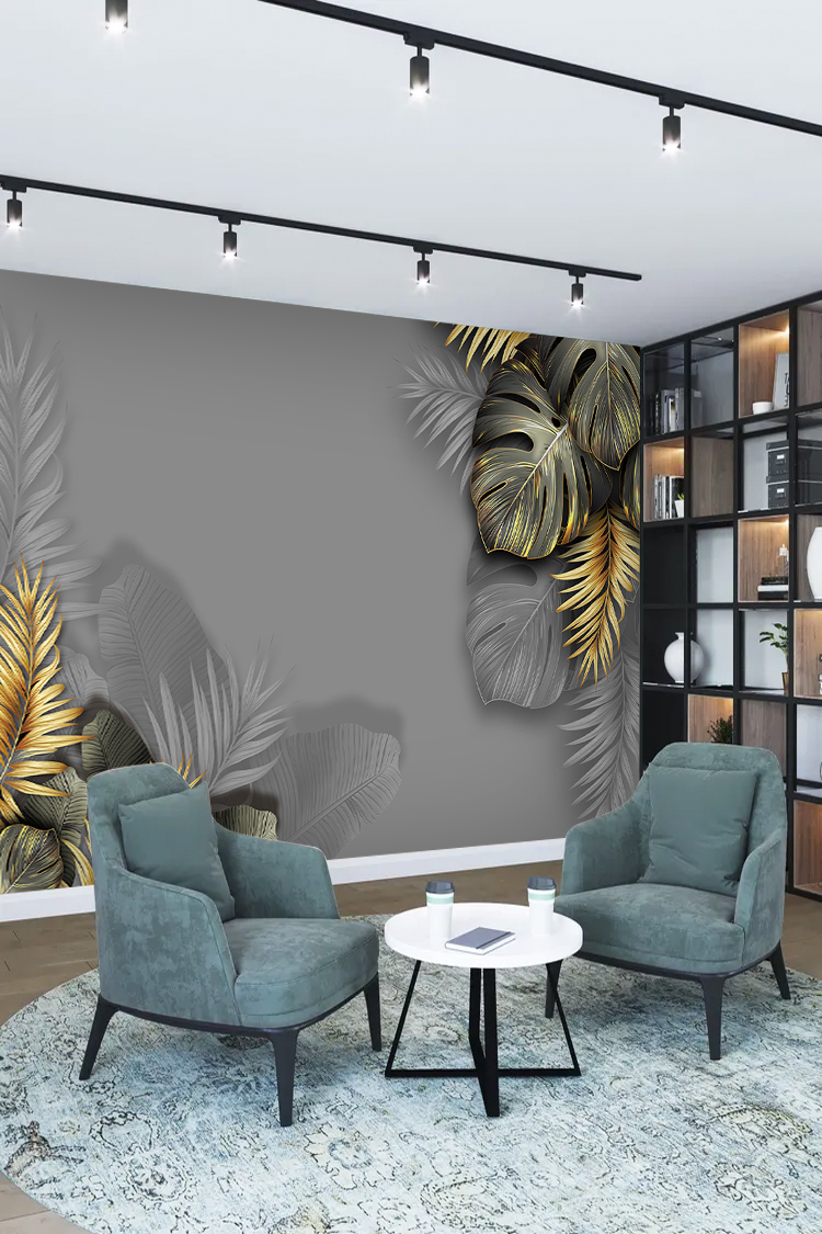 Gri Zemin Üzerinde Altın Tropikal Yaprak Desenli Duvar Kağıdı