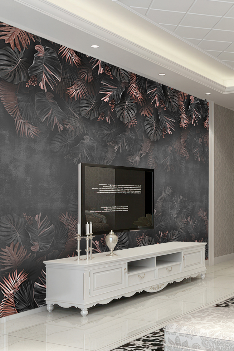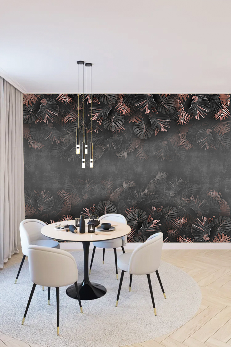 Gül Altın Siyah Tropikal Yaprak Desenli Duvar Kağıdı