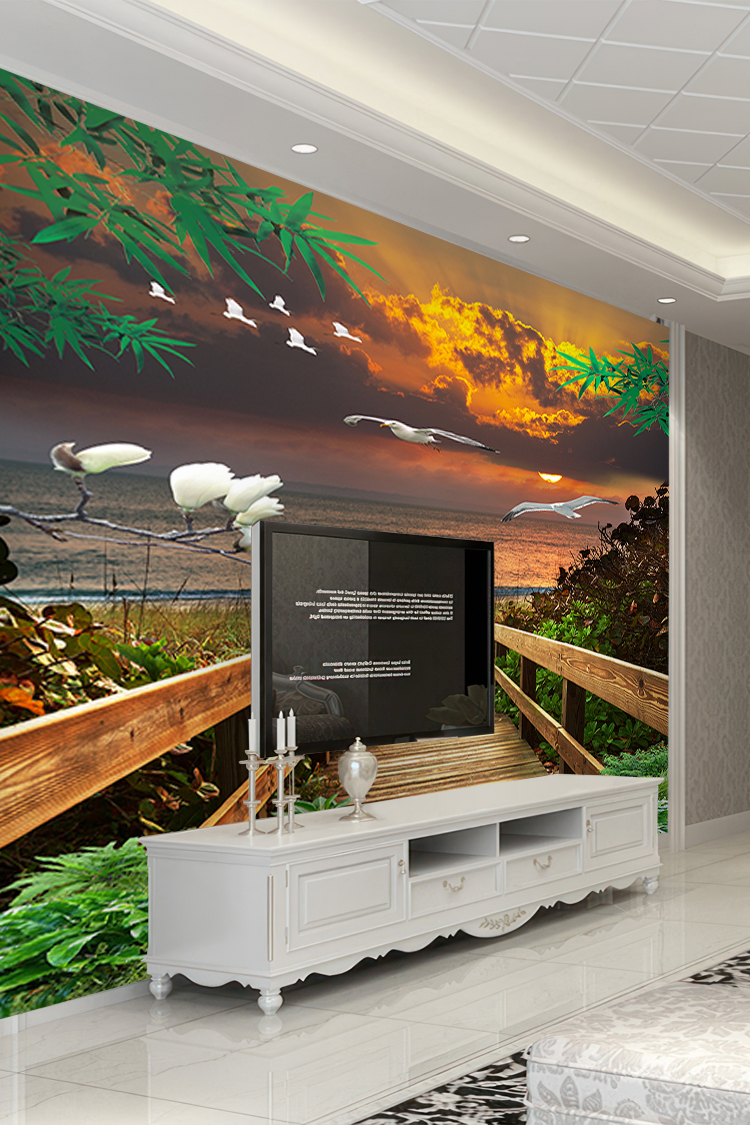 Günbatımı Deniz Kuşları ve Ahşap Köprü Duvar Kağıdı