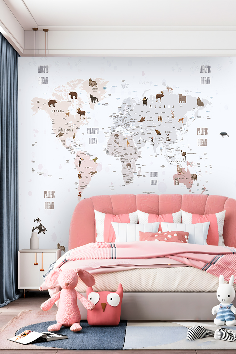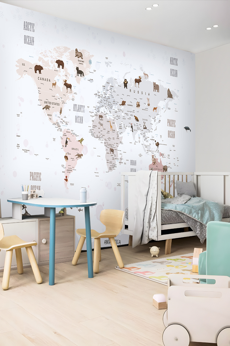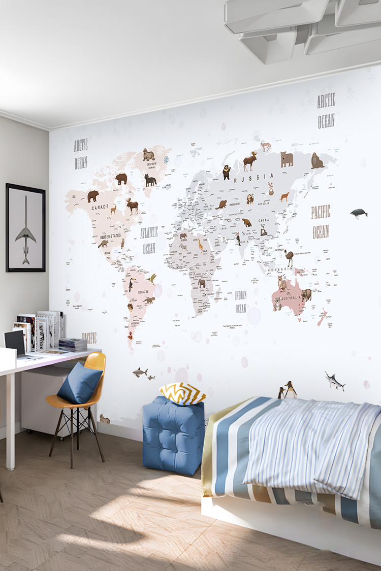Hayvanlar ve Dünya Haritası Temalı Duvar Kağıdı