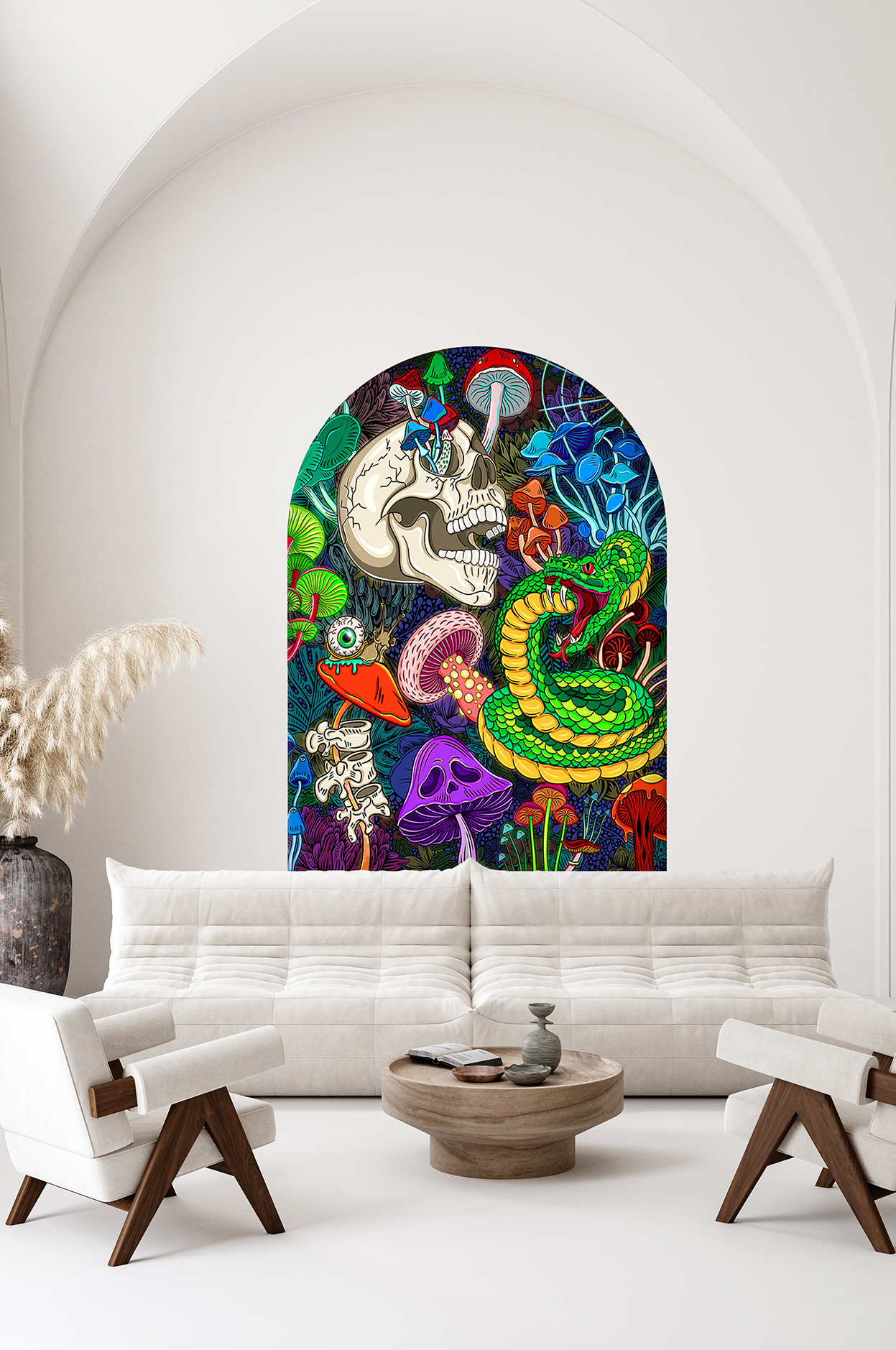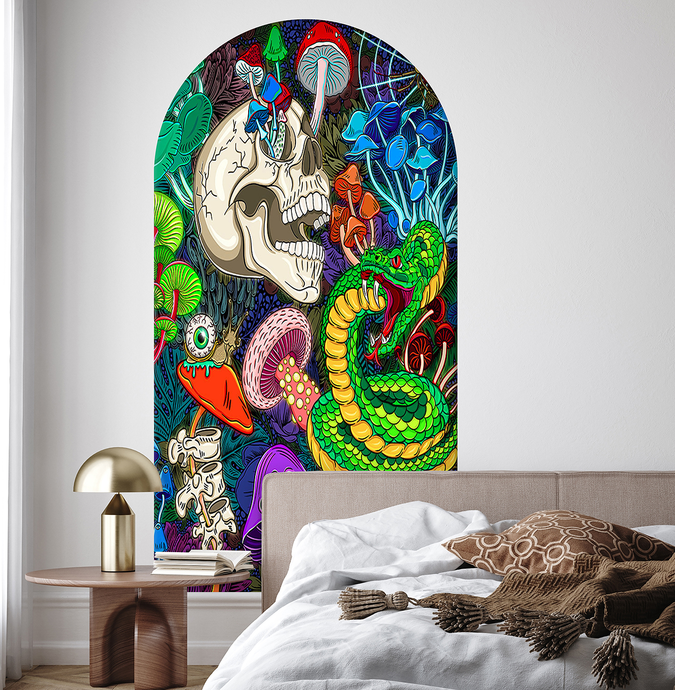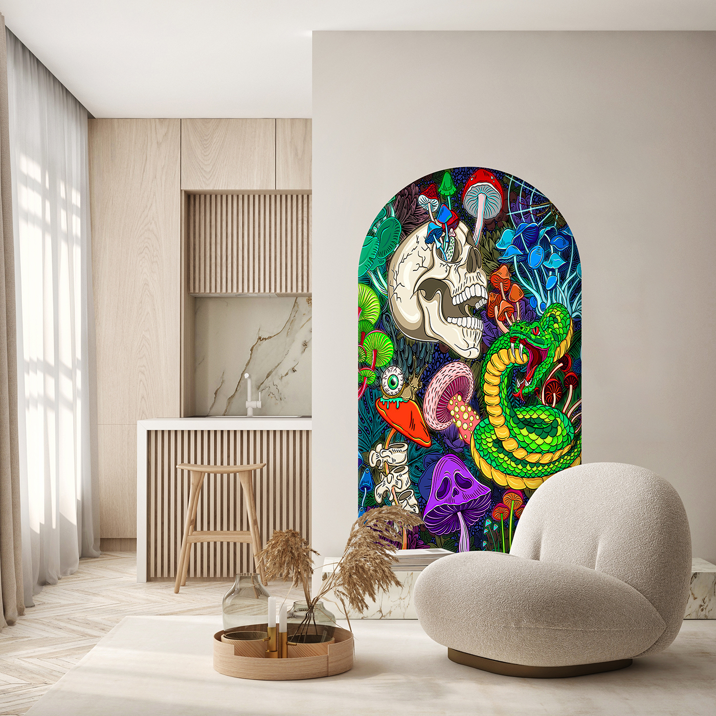 Kafatası ve Yılan Desenli Duvar Kağıdı – Renkli Mantar ve Doğa Temalı Tasarım 🎨🚂