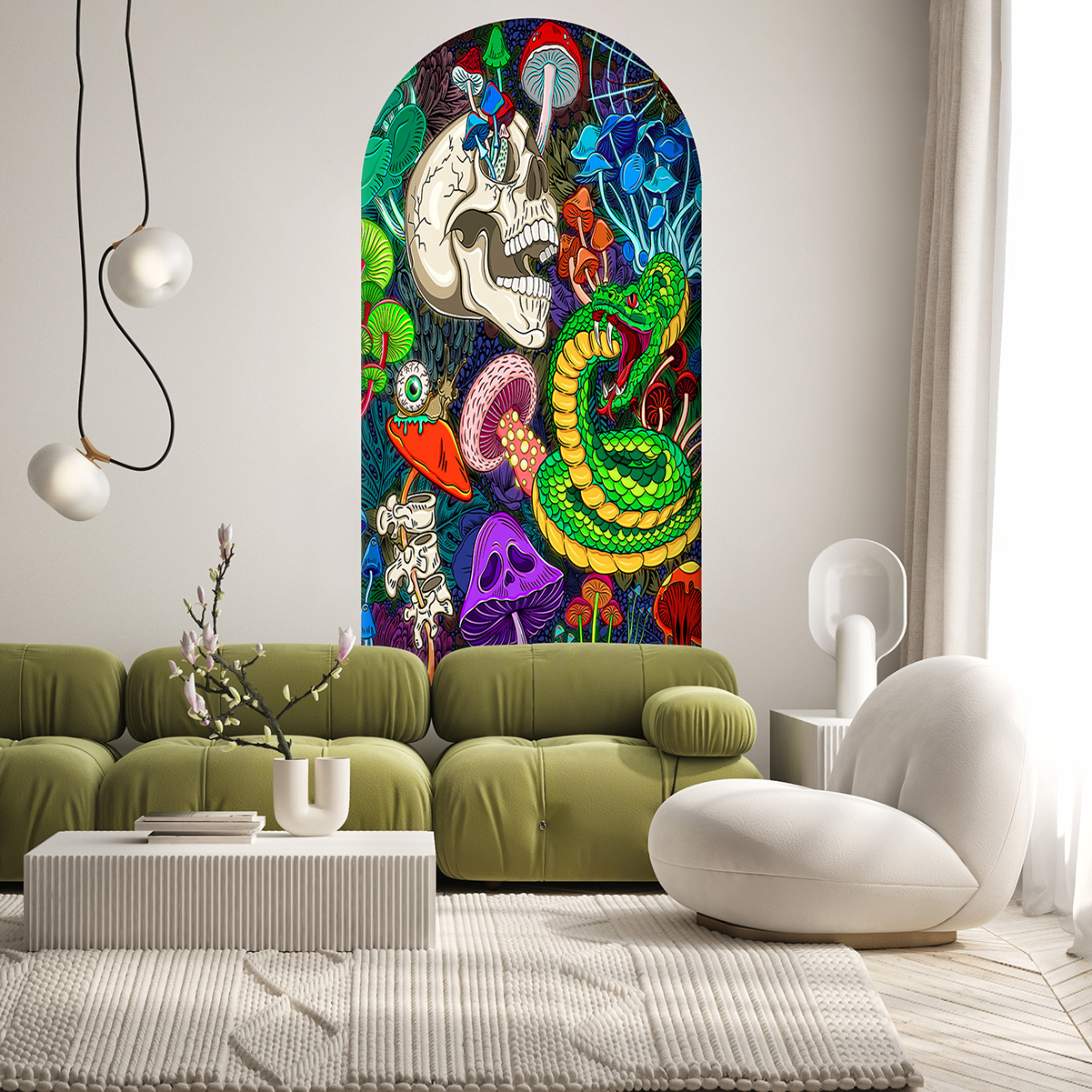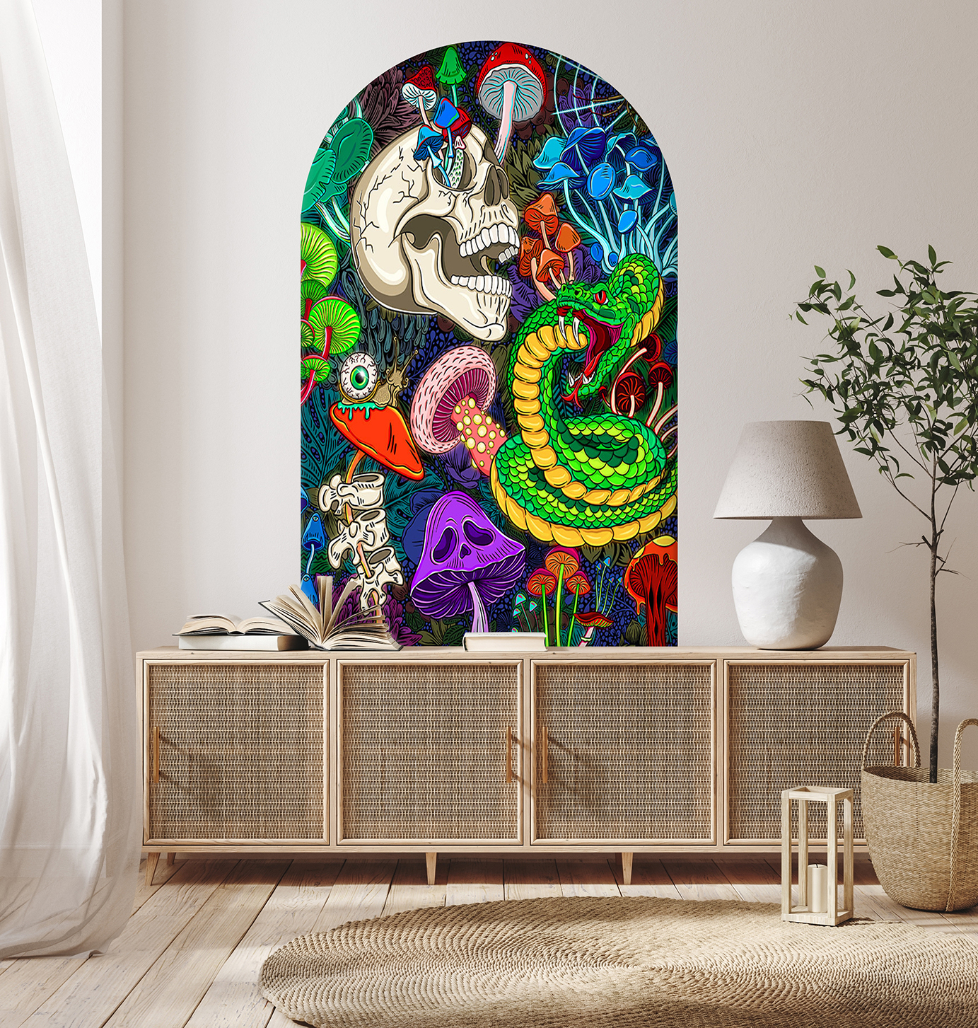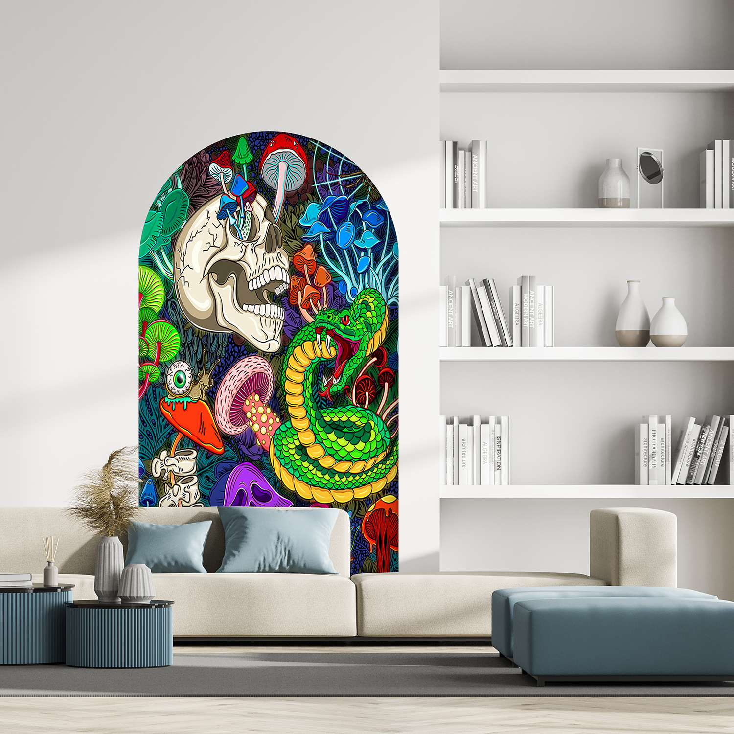 Kafatası ve Yılan Desenli Duvar Kağıdı – Renkli Mantar ve Doğa Temalı Tasarım 🎨🚂