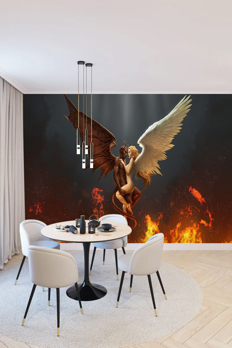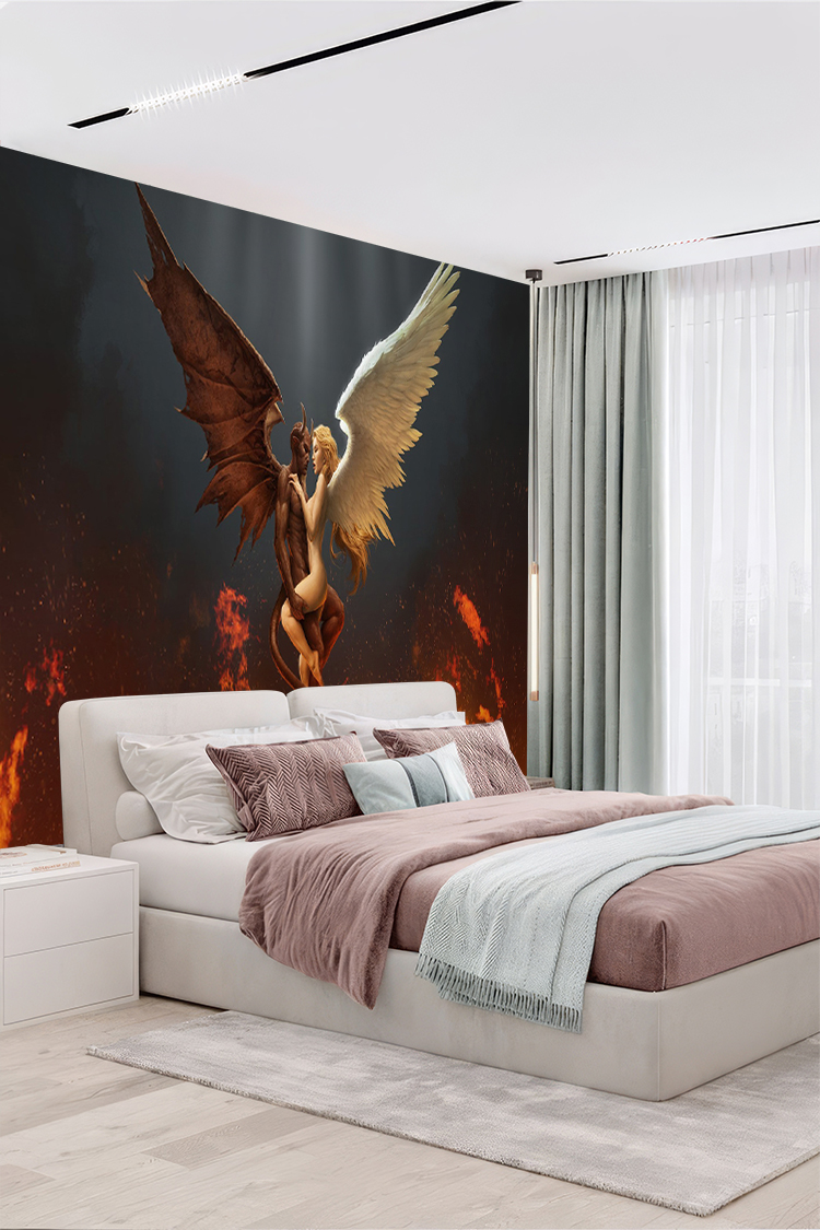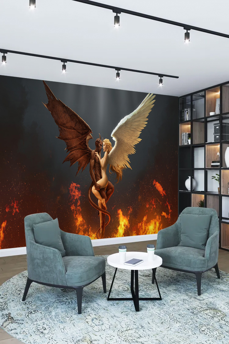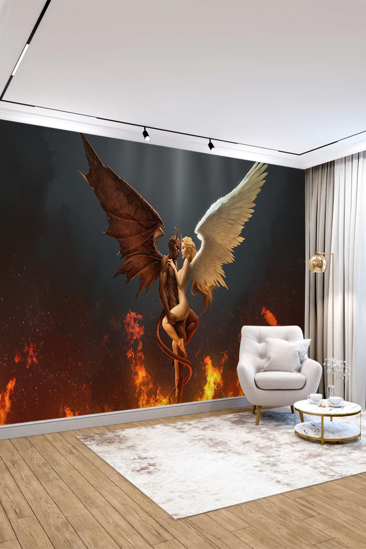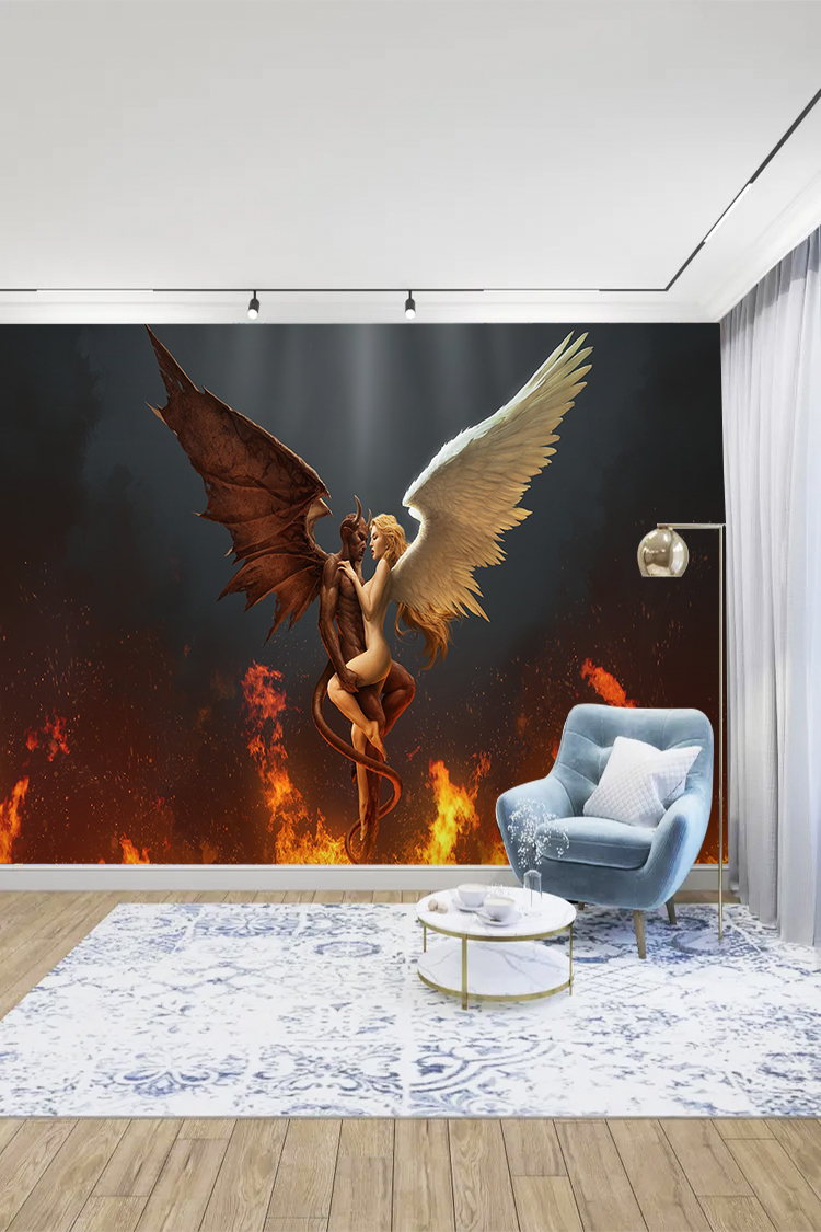 Kanatlı Melek ve Şeytan Figürü ile Ateşli Arka Plan Duvar Kağıdı