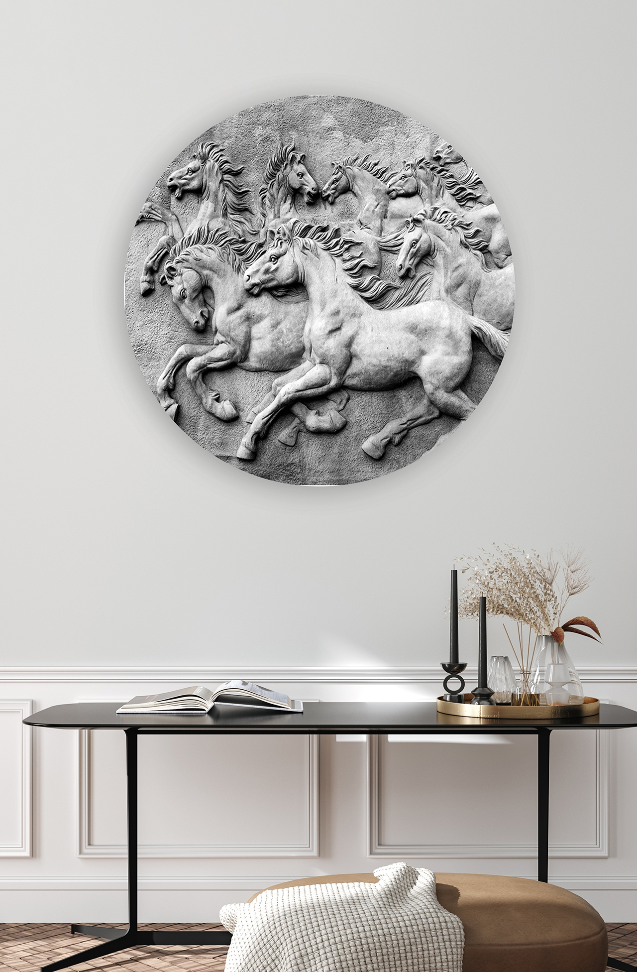 Koşan Atlar ve Heykel Tasarımı Temalı Duvar Kağıdı – Sanatsal Yüzey 🎨🚂