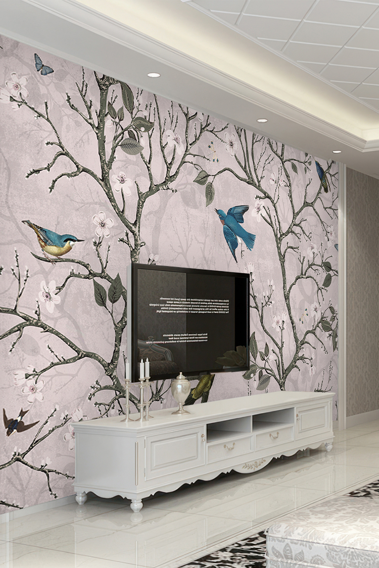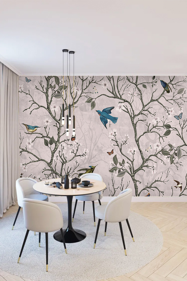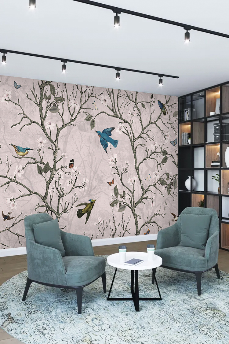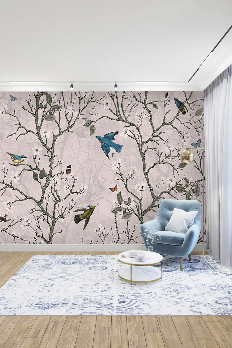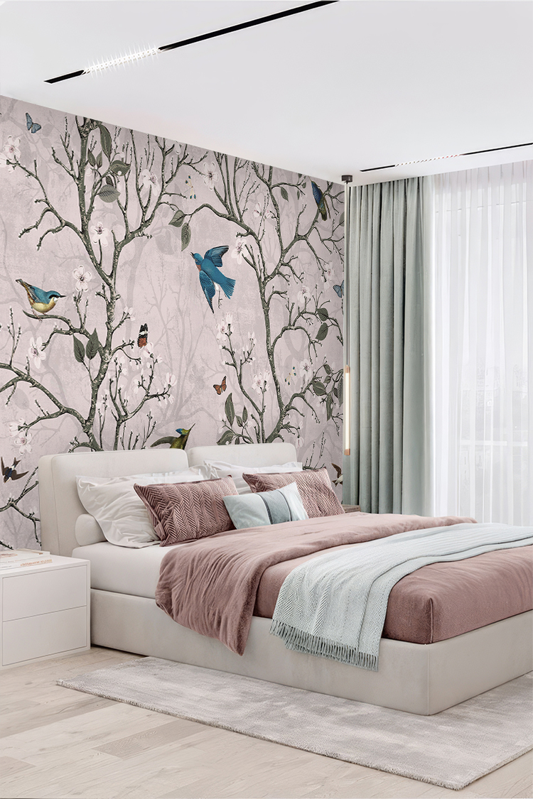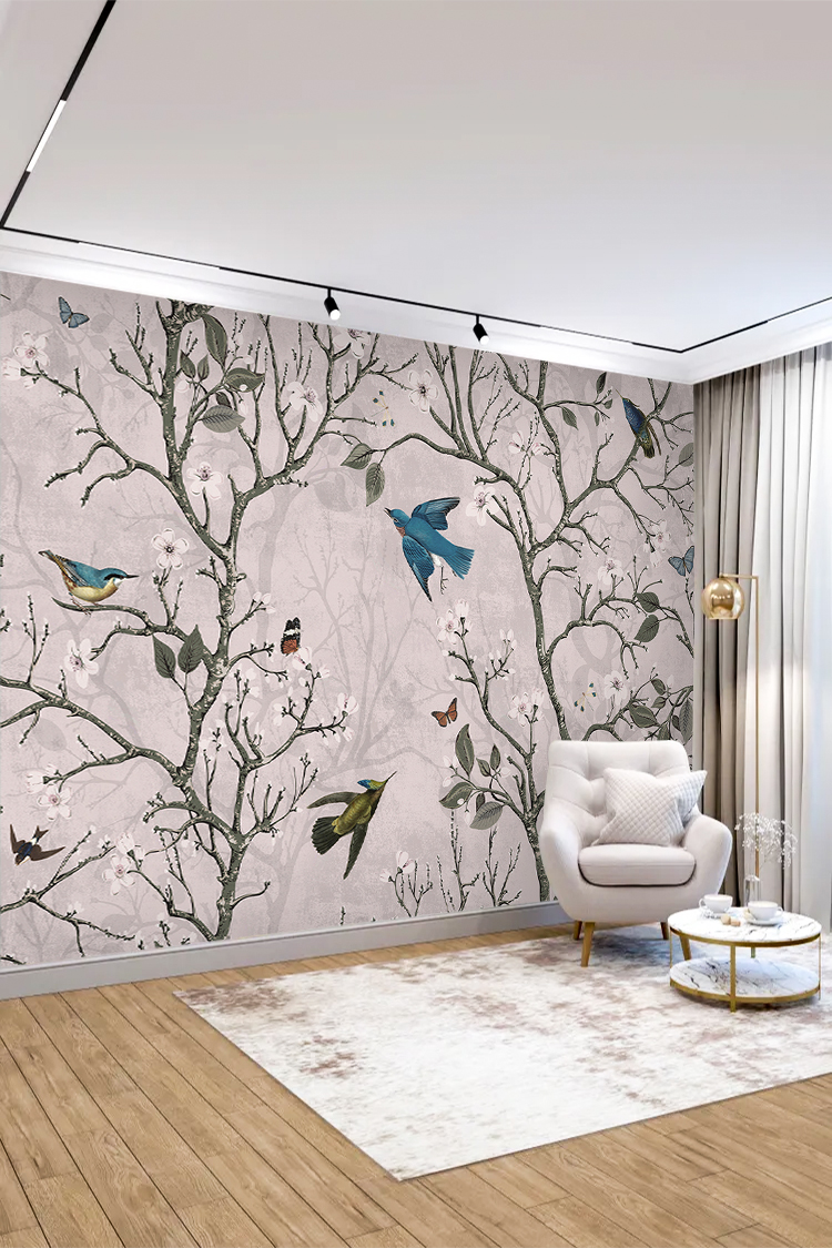 Kuşlar ve Çiçek Desenli Pastel Duvar Kağıdı