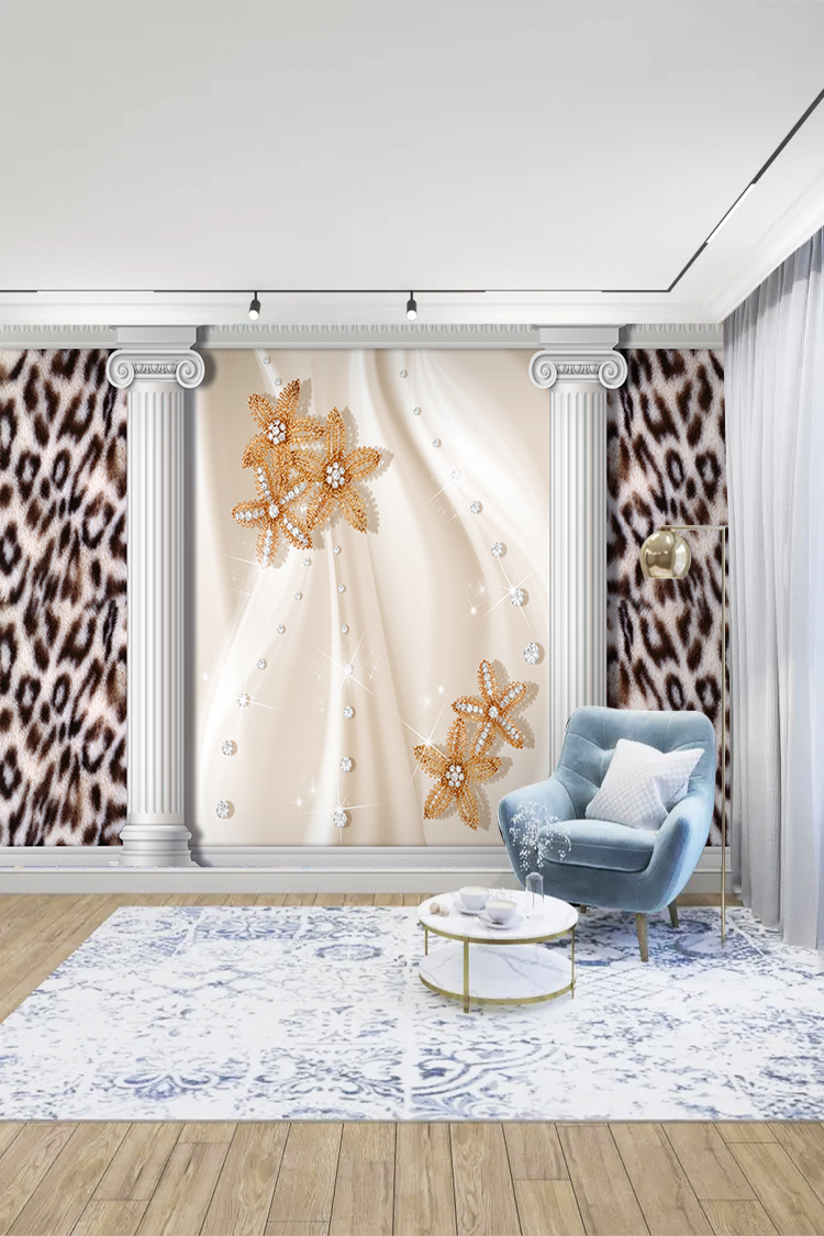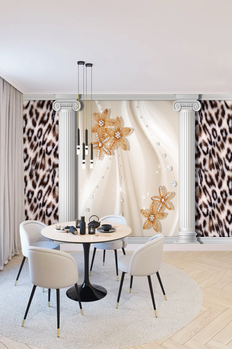 Leopar Desenli ve Kristal Çiçekli Duvar Kağıdı