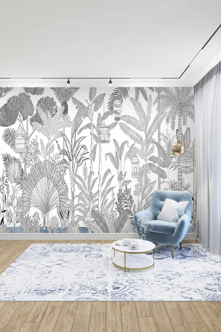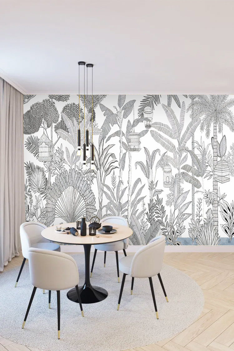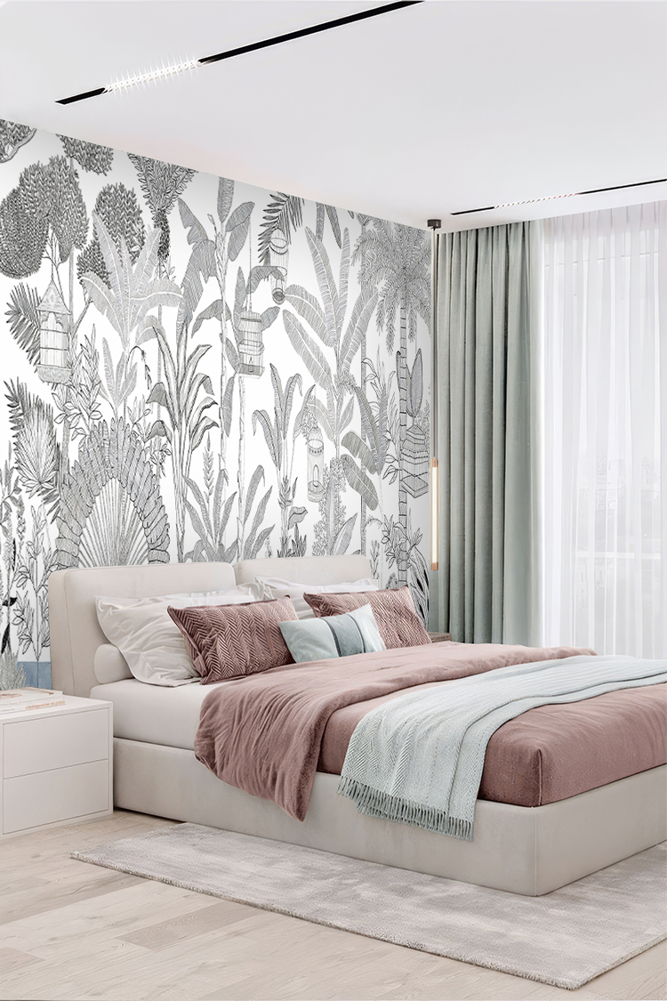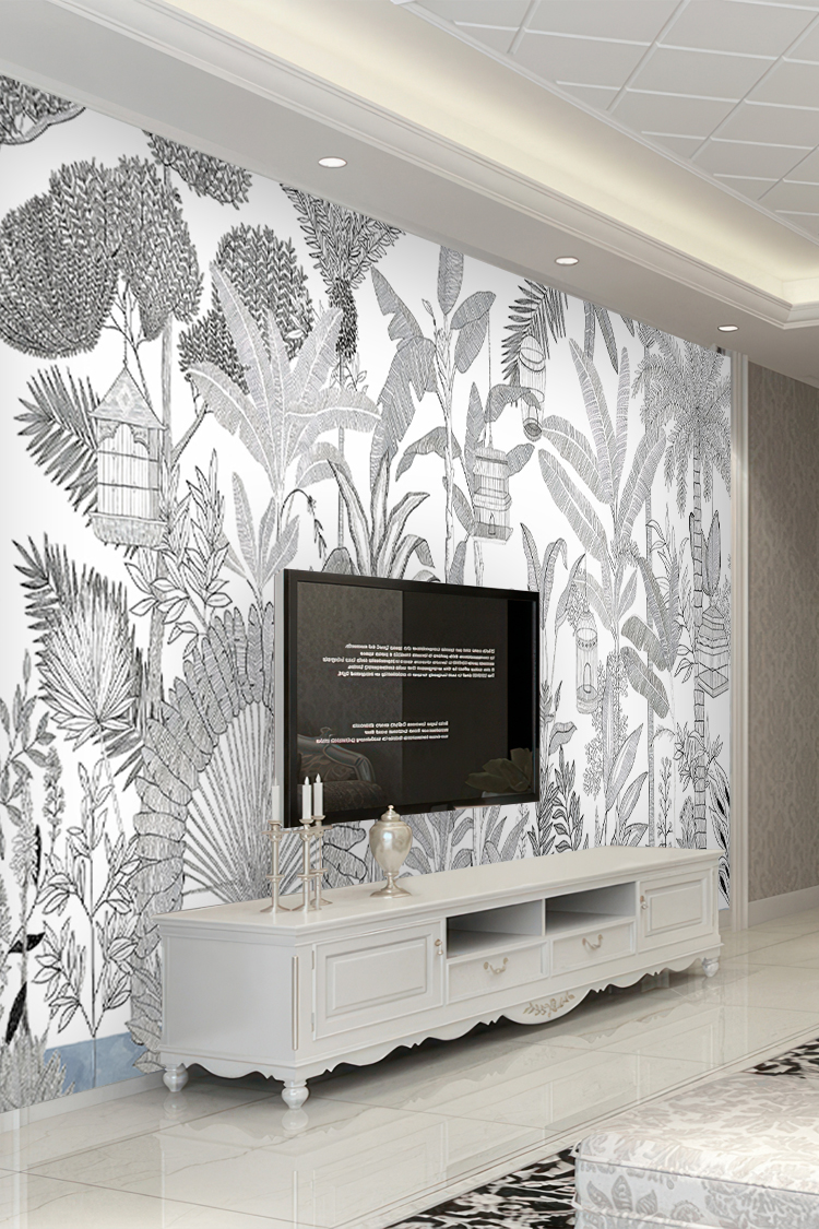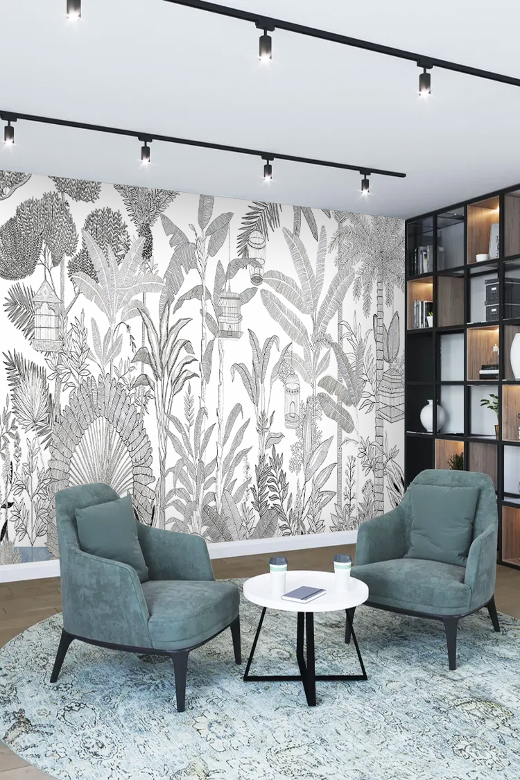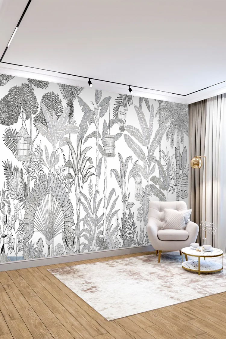 Monokrom Tropikal Yapraklar Desenli Duvar Kağıdı