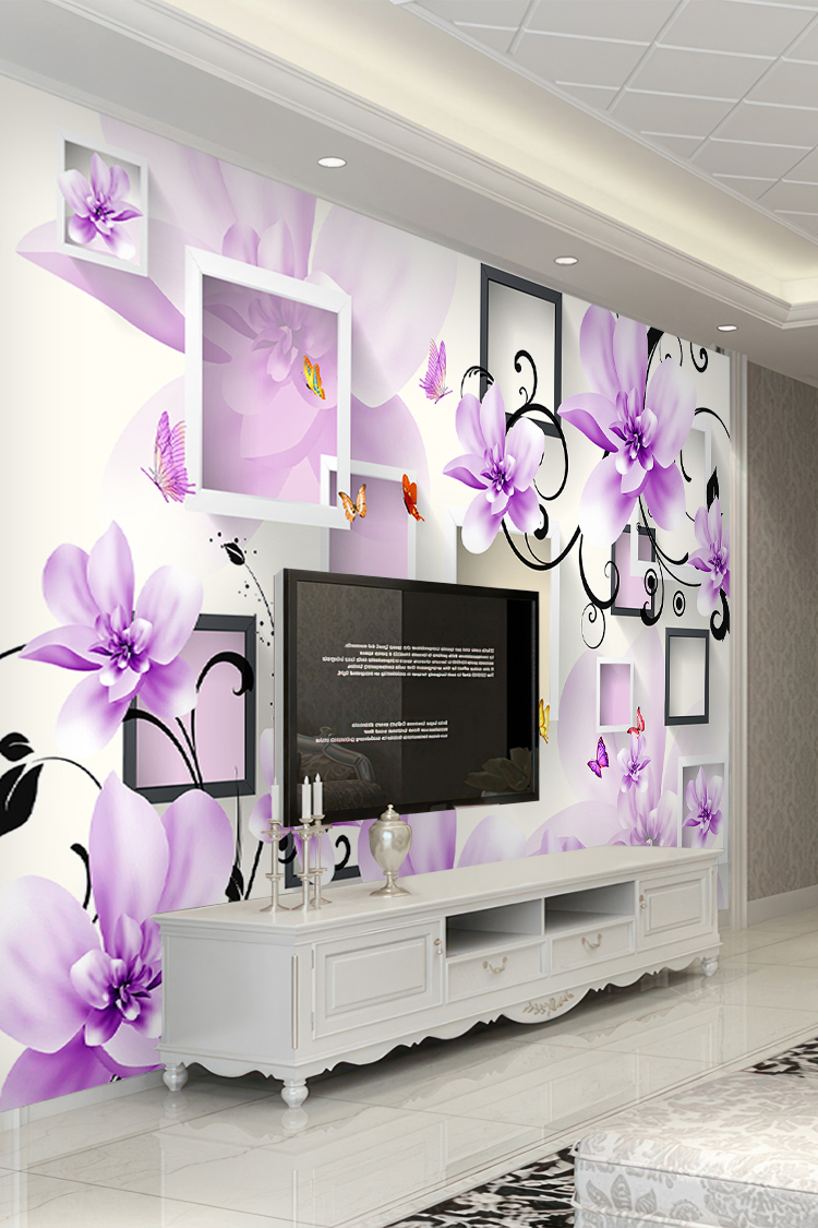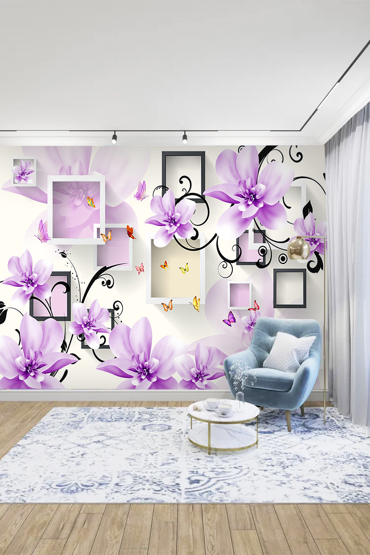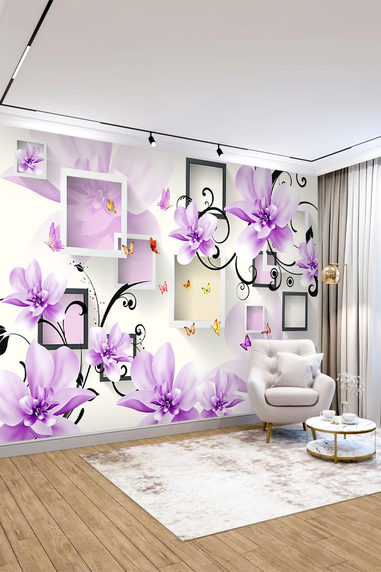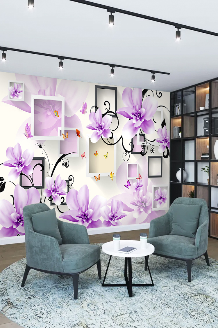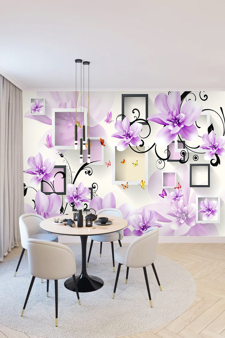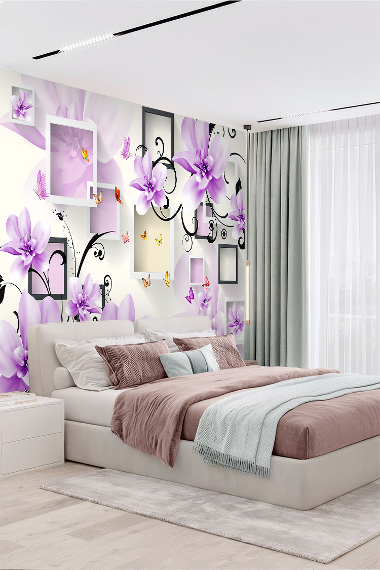 Mor Çiçekler ve Geometrik Çerçeveli Modern Duvar Kağıdı