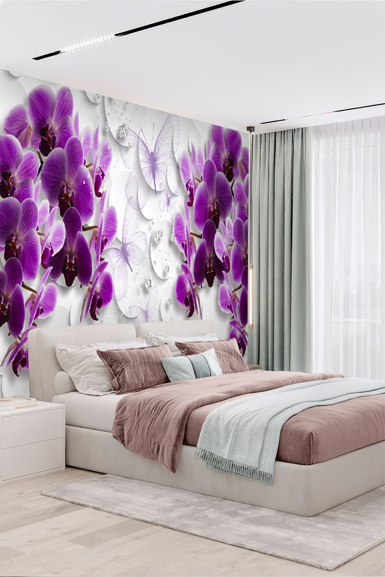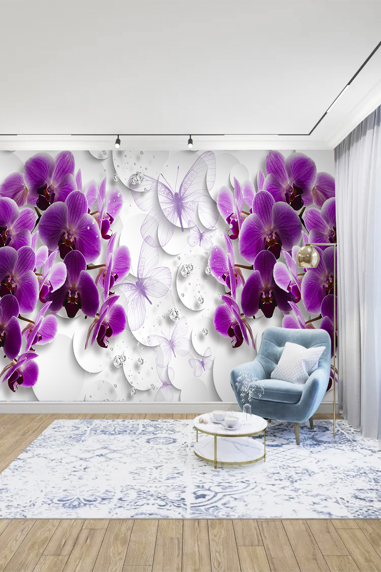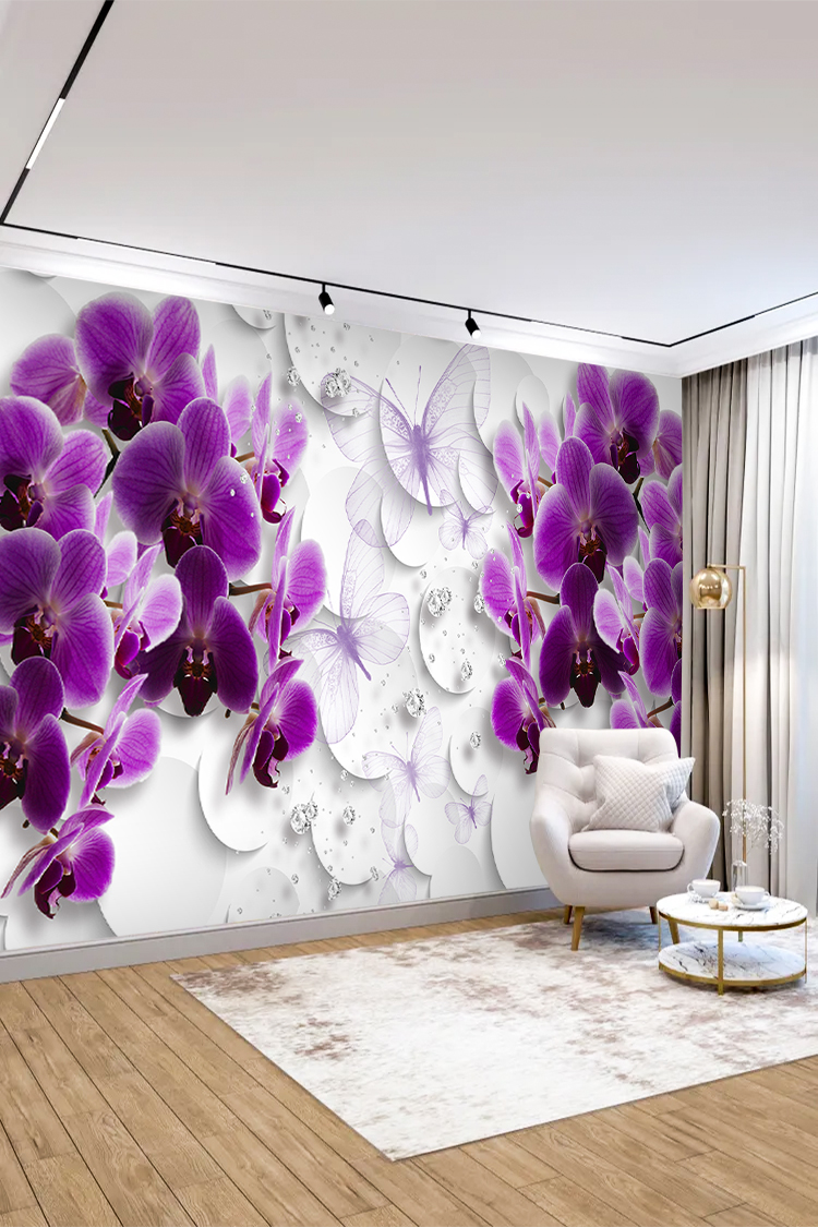 Mor Orkide ve Kelebek Desenli Duvar Kağıdı