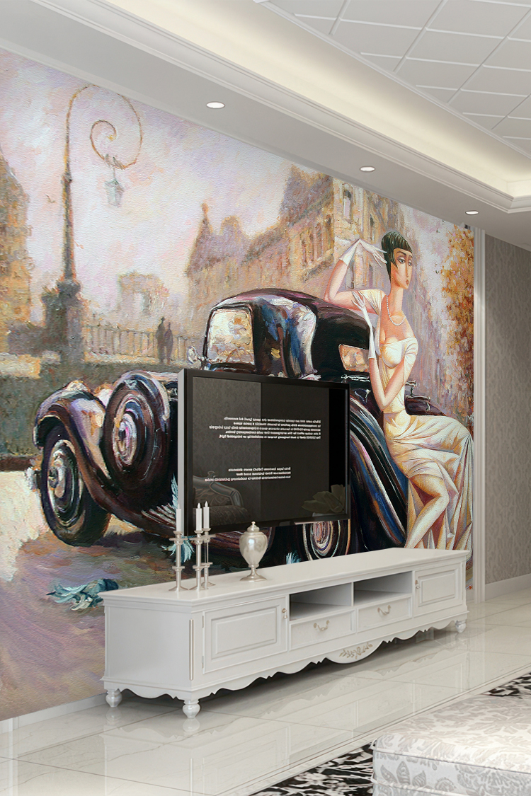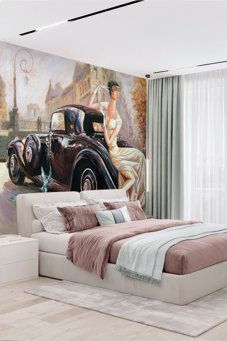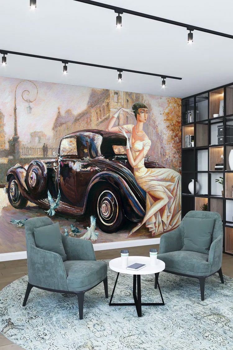 Nostaljik Kadın Portresi ve Klasik Araba Temalı Duvar Kağıdı