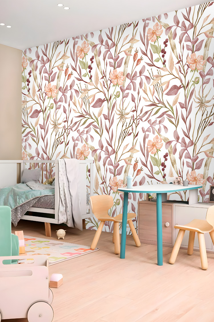Pastel Botanik Çiçek Yaprak Desenli Duvar Kağıdı