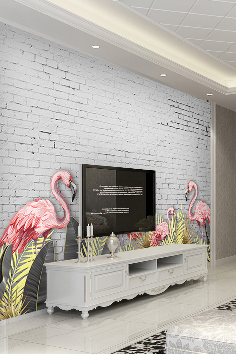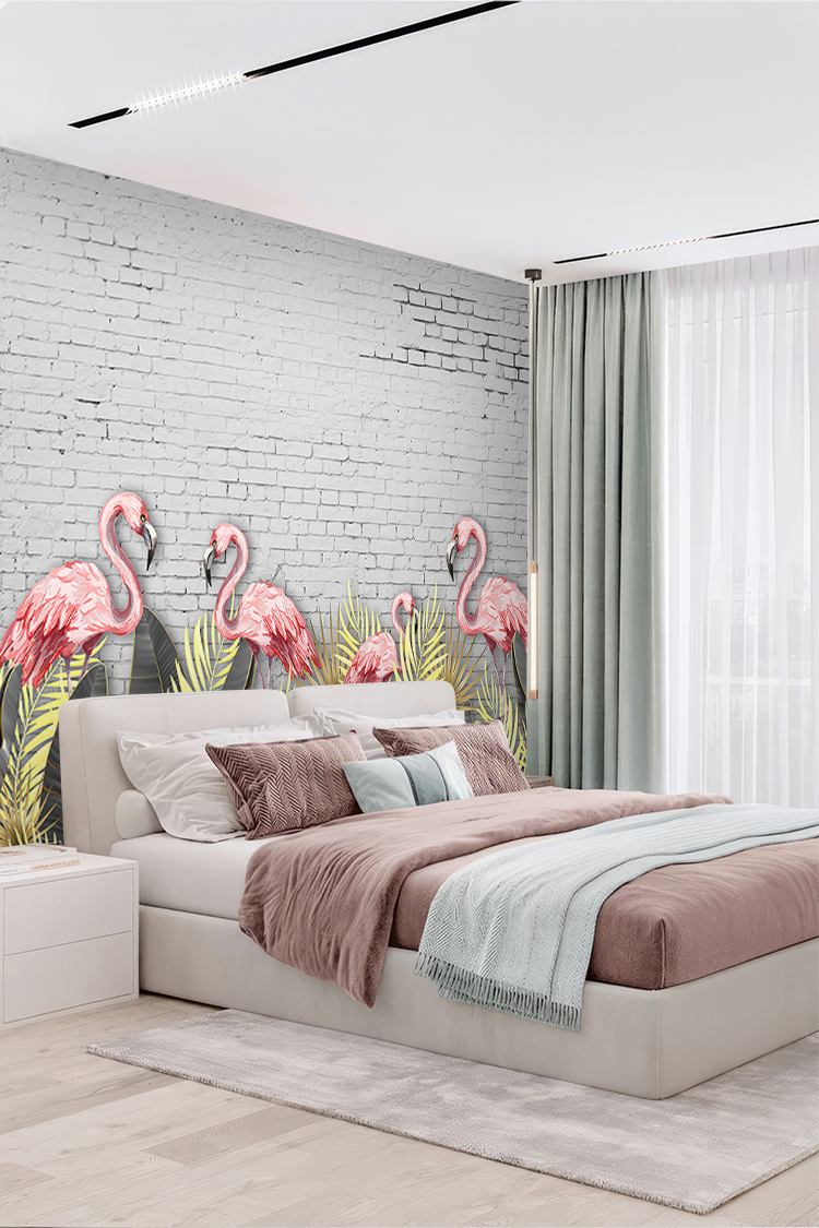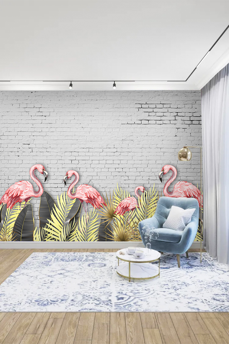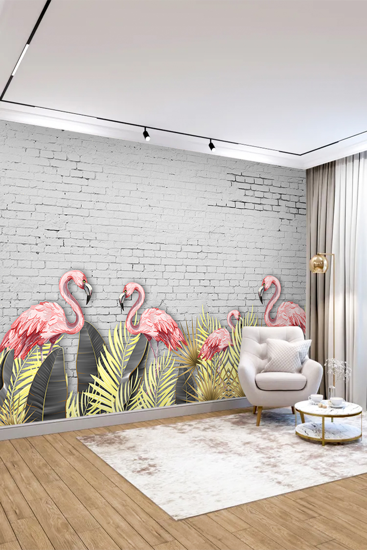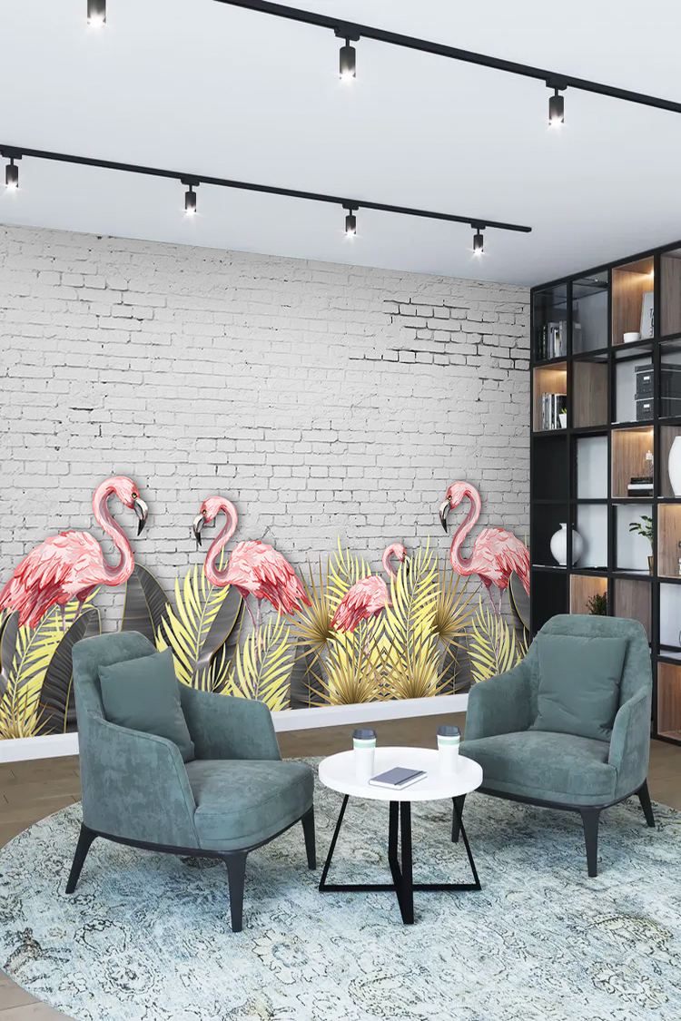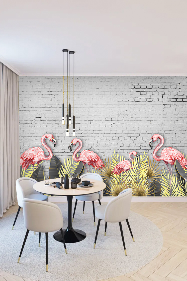 Pembe Flamingo ve Yeşil Yaprak Desenli Duvar Kağıdı