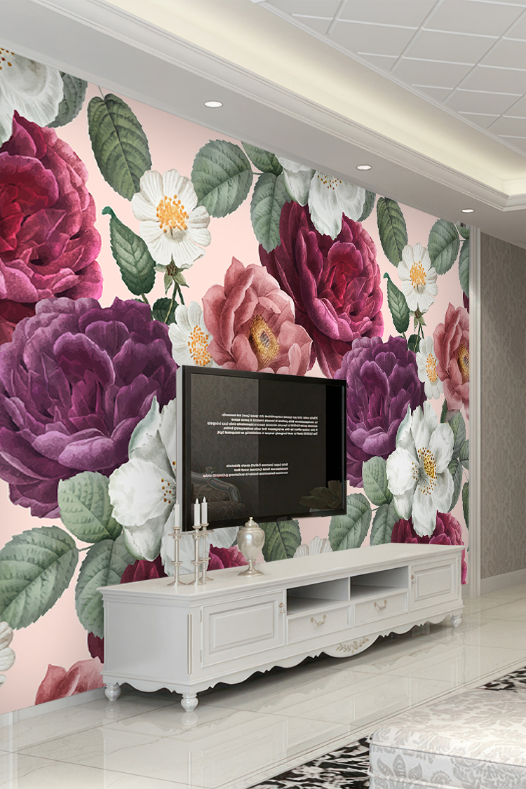 Pembe ve Mor Çiçek Desenli Duvar Kağıdı