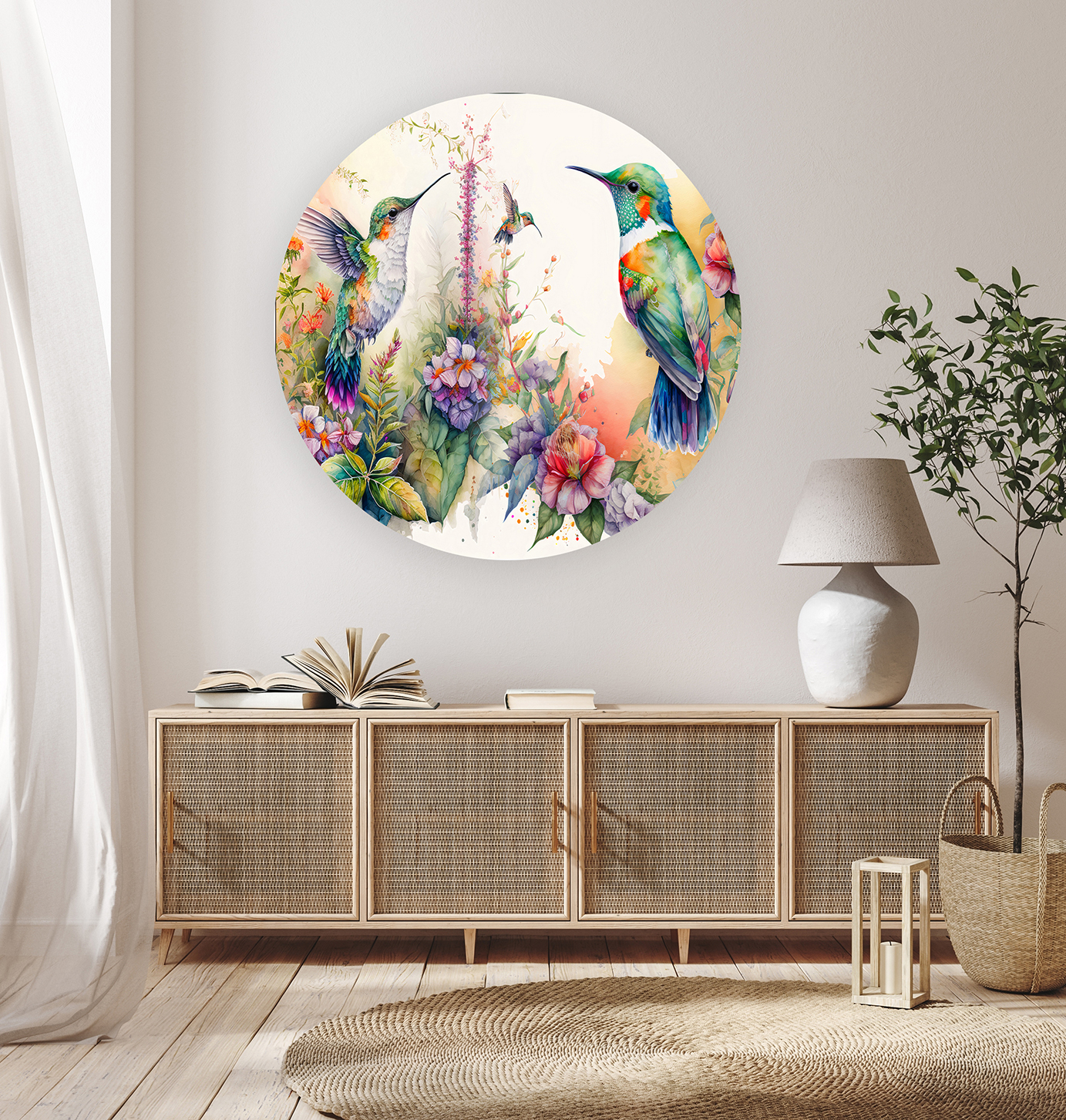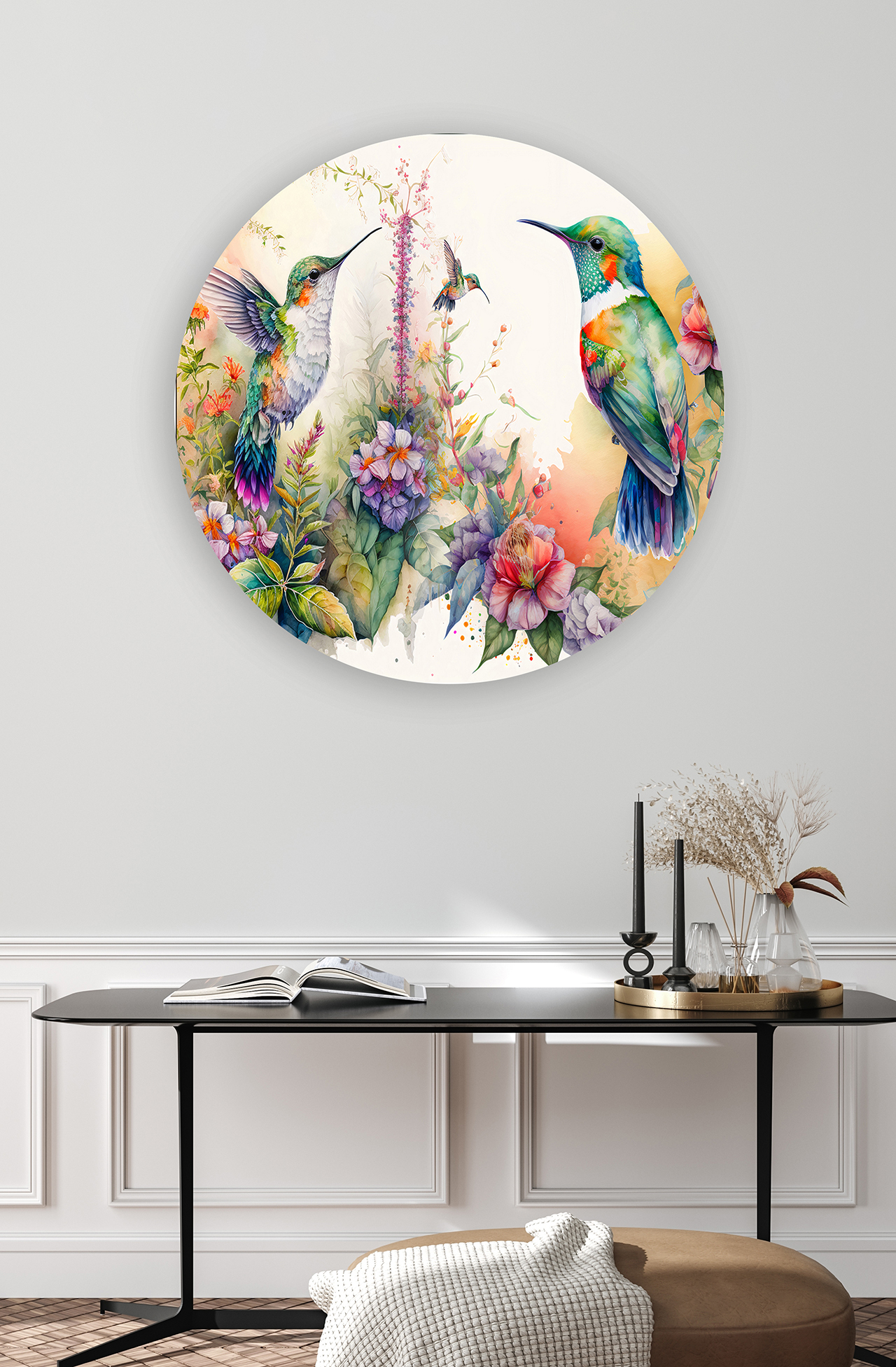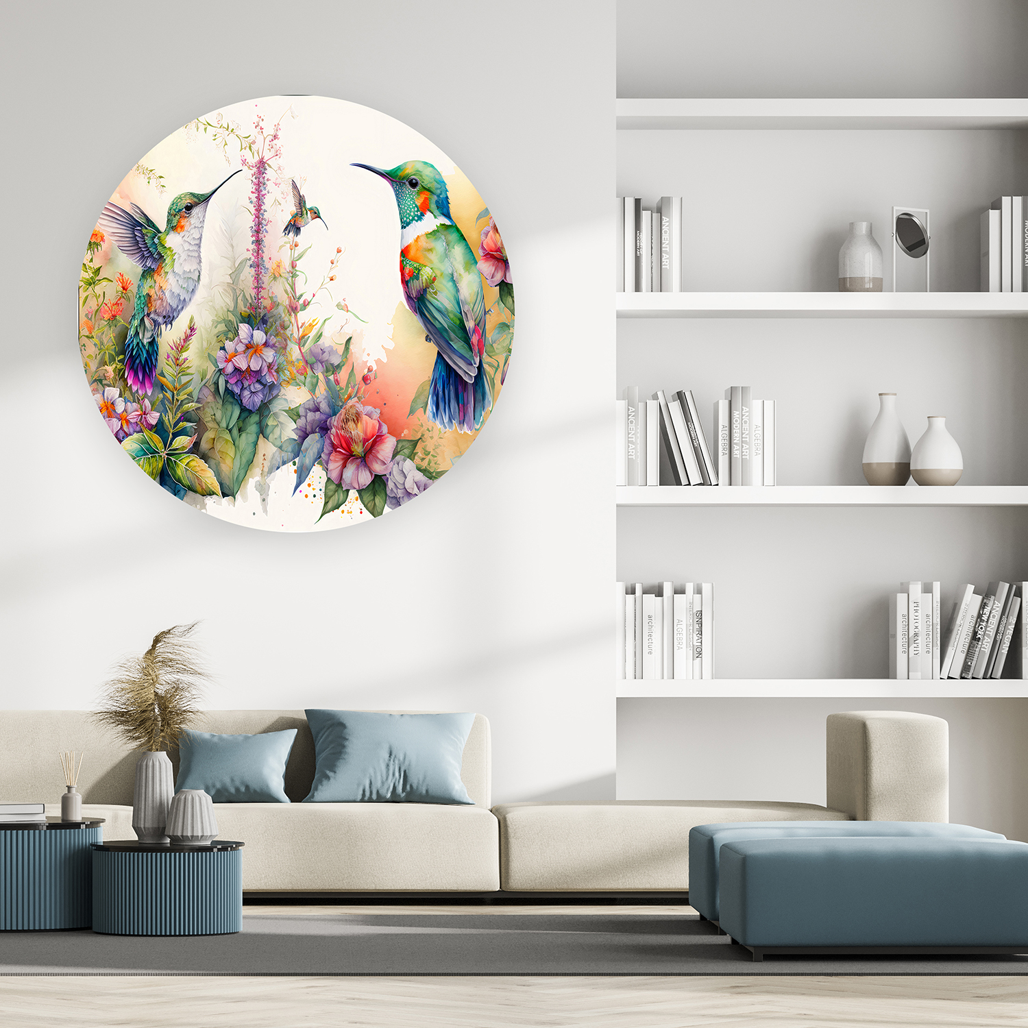 Renkli Hummingbird ve Çiçekli Yuvarlak Duvar Kağıdı – Canlı ve Sanatsal Tasarım 🎨🚂