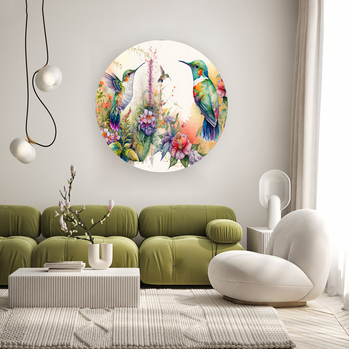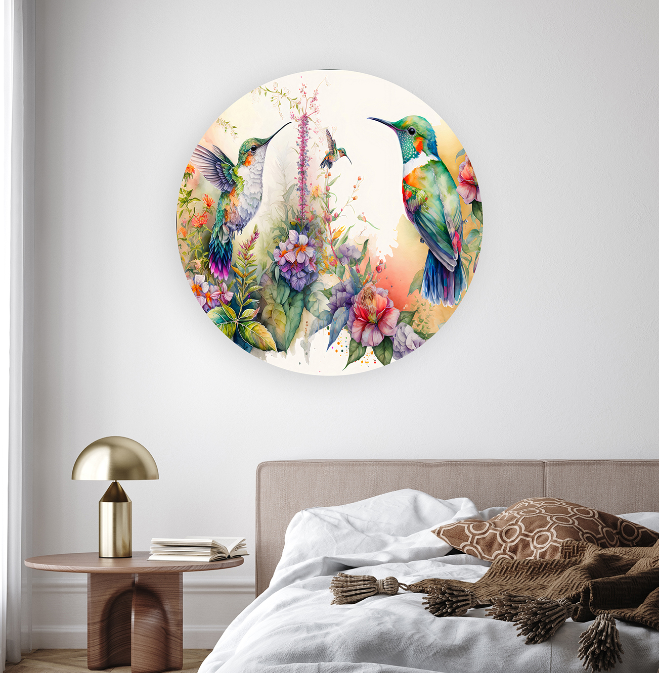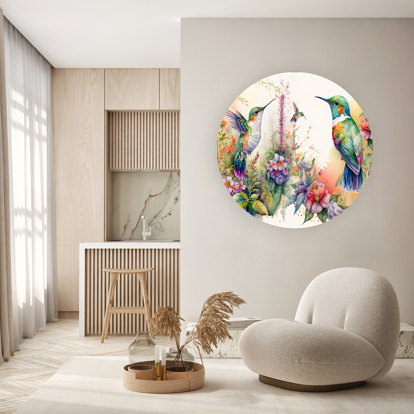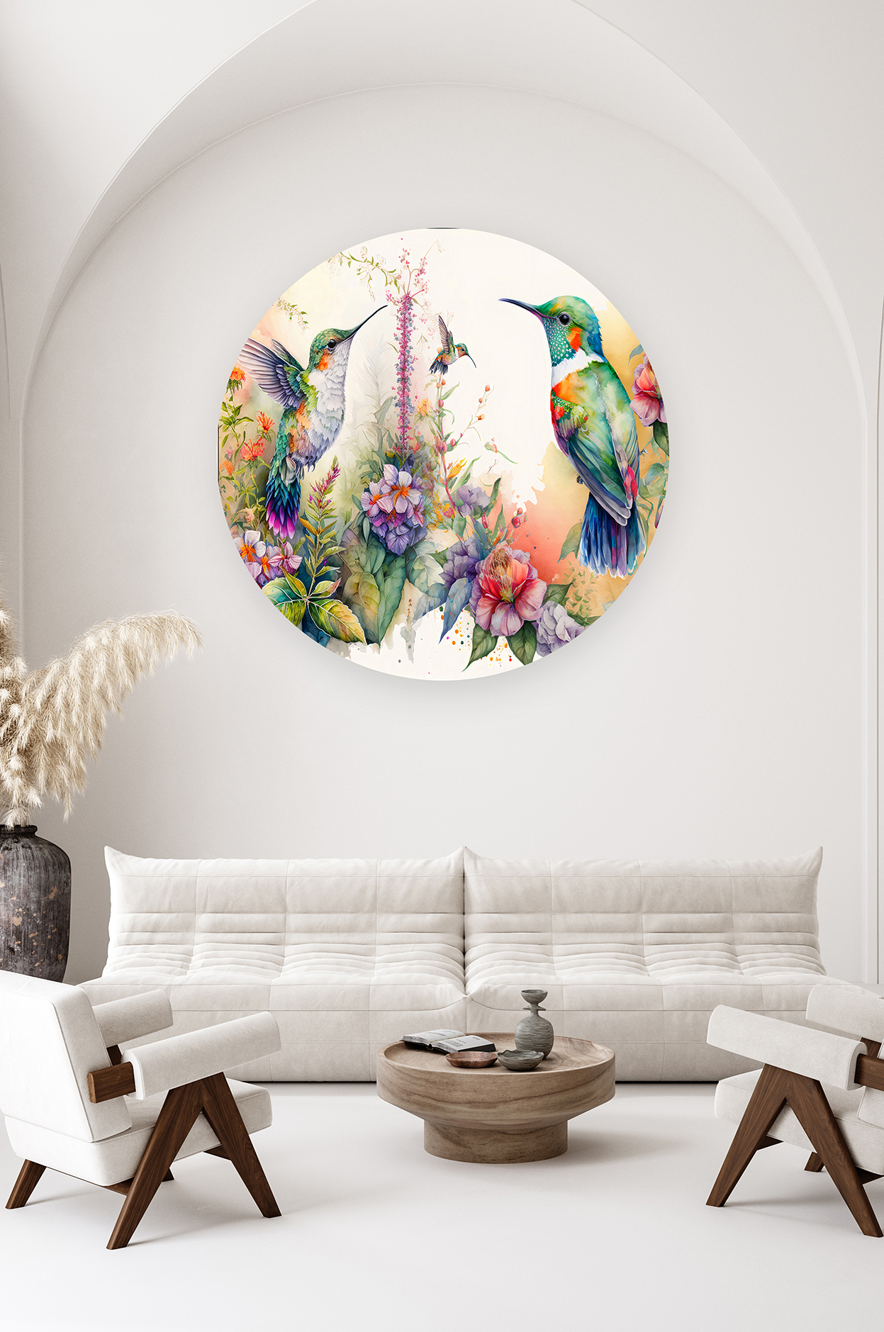 Renkli Hummingbird ve Çiçekli Yuvarlak Duvar Kağıdı – Canlı ve Sanatsal Tasarım 🎨🚂