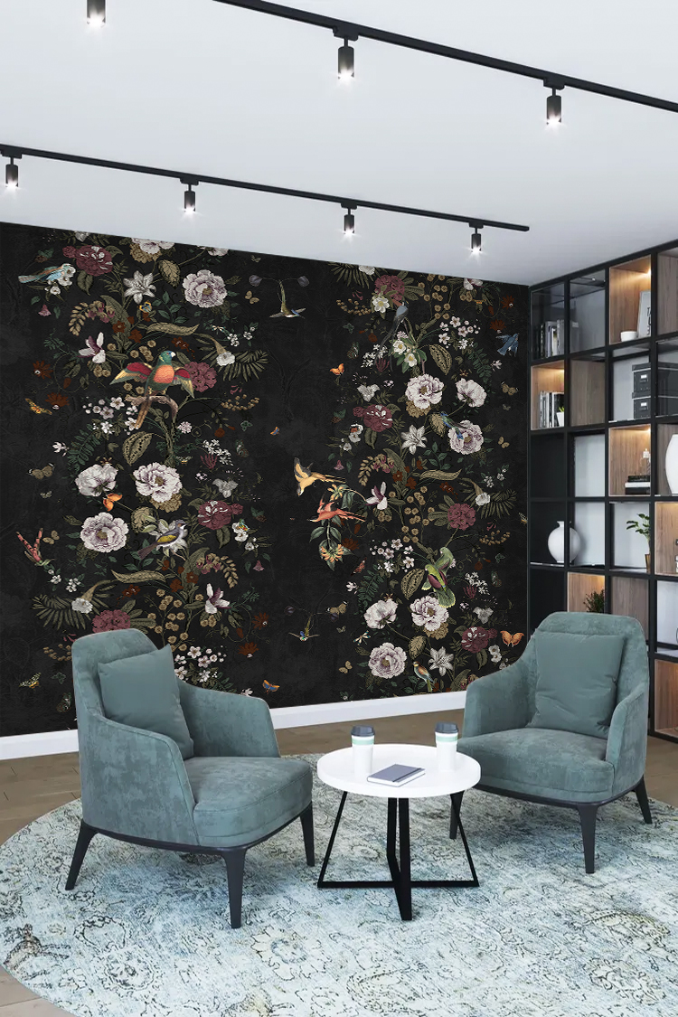 Renkli Kuş ve Çiçek Desenli Duvar Kağıdı