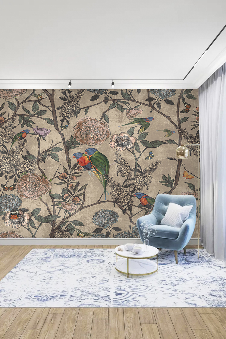 Renkli Kuş ve Çiçek Desenli Duvar Kağıdı